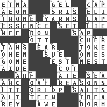ACROSS 1. Inactive volcano in Sicily 5. Set 8. Head covering 11. A really long time 12. Indian titles of respect 14. Connecticut Ivy Leaguer 15. Marketplace scale 17. Entertaining tales 18. Infant locale 19. Gist 21. Arrange properly for use 22. Whopper 23. Born 24. Spanish title 25. Plant excrement 27. Baseball player Mel 28. "Mermaids" star 31. Scottish caps 35. Hearing organ 37. Casino tip 38. Sign of things to come 39. Take to court 41. Washington bills 42. Went 43. Eastern Standard Time (abbr.) 45. Egg locale 46. Assistant 47. Small bed 49. Sandy's bark 51. Had dinner 52. Ocean 55. Curve 57. Clumsy lout 60. Thinks logically 62. Cards in a Roman deck? 63. Fourth or lowest deck 65. Table seasonings 66. The first octave above the treble staff 67. Adolescent 68. It may be bright or harebrained 69. Marina Del _, California 70. Deep reverence 71. Dormintory (informal) DOWN 1. Ingested 2. Laconic 3. Trap for birds or small mammals 4. Singer Murray 5. Girls' org. (abbr.) 6. Blunders 7. Actor's bit 8. Portable communications device 9. Jai ____ 10. Corncob 13. Fast planes 16. Inside; within (prefix) 17. Gossips 20. ____ d'Azur (French Riviera) 26. Gambison 29. Supplements with great effort 30. Remainder 31. Ancient Roman robe 32. Mine, in Marseilles 33. Ananias' fault 34. Contemptuous expression 36. Sorrow 40. Fortification 44. Haul 48. Beverages made from leaves 50. One third of a yard 52. Twentieth part of a lira 53. Keyboard key 54. Indian state 55. Having or resembling wings 56. Cause heat under the collar 58. Length times width 59. Soared 61. Stated 64. Single