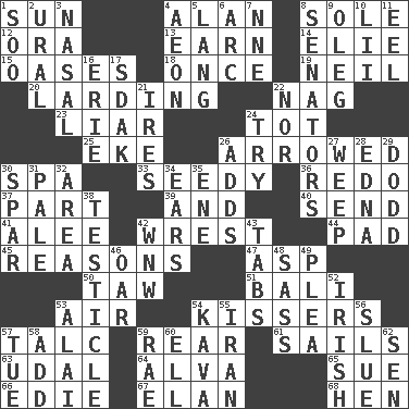 ACROSS 1. Player for Phoenix 4. Actor Alda or Thicke 8. Not divided or shared with others 12. Mouth or opening 13. Merit 14. Writer Wiesel 15. Fertile tracts in a desert 18. Single time 19. Famous astronaut Armstrong 20. Preparing or cooking with lard 22. Tired old horse 23. One who doesn't tell the truth 24. Small child 25. Make supply last 26. Moved like an arrow 30. Health resort 33. Full of seeds 36. Redecorate 37. Component 39. Plus 40. Transmit 41. Toward shelter 42. Take or capture by force 44. Groovy apt. 45. Thinks logically 47. Viper 50. The 23rd letter of the Hebrew alphabet 51. Indonesian resort city 53. Atmosphere 54. Smoochers 57. Baby powder 59. Stern 61. Moves on water 63. Allodial 64. Inventor's middle name 65. Take to court 66. Singer Brickell 67. Enthusiasm 68. Layer DOWN 1. "Barney Miller" actor Jack 2. Mountain range 3. Relating to the nose 4. Period of immesurable duration 5. Long (Scottish) 6. Curve 7. Compass dir. 8. Elected representatives 9. Cassini of fashion 10. Cards in a Roman deck? 11. Snakelike fish 16. One of the Great Lakes 17. Neighbor of Neb. 21. Angers 22. Not either 24. Attempt to accomplish something 26. Sums up 27. Shed a tear 28. Pulitzer Prize-winning author Ferber 29. Texas town _ City 30. Coast Guard woman 31. Diluted with white 32. Length times width 34. Hearing organs 35. Compass dir. 38. One of the two male reproductive glands 42. Compass dir. 43. Bar bills 46. Boat paddle 48. Backtalk 49. Entreaty 52. From or relating to Ireland 53. Mountain range southwest of Kyrgyzstan 54. Polynesian shrub of the pepper family 55. SW Asia republic 56. Change direction abruptly 57. Third day of the wk. 58. Find the sum of 59. Actress Charlotte 60. Pipe bend 62. Elected rep.