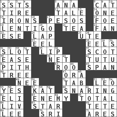 ACROSS 1. Fast planes 5. Santa ___, CA 8. Feline 11. Become fatigued 12. Lie 14. Single 15. Removes the wrinkles 17. Mexican monetary units 18. Enemy 19. Small, flat, pigmented spot on the skin 21. Afternoon social gathering 22. Avid follower 23. Compass dir. 24. Pet locale 25. Shoshoni 27. Snakelike fish 28. Snakelike fish 31. Position in a hierarchy or organization 35. Mouth edge 37. Highlander 38. Relaxation 39. Remaining after all deductions 41. Ballerina skirt 42. Essential or central part 43. Friend of Pooh 45. Connect, as a bridge 46. Relationship diagram 47. Mouth or opening 49. Born 51. Keyboard key 52. Lion 55. Consenting reply 57. Krazy ___ of comics 60. Catching in a trap 62. Biblical high priest 63. Foe 65. Add up to 66. 54 in ancient Rome 67. Play the lead 68. Wig 69. Area sheltered from the wind 70. _ Lanka 71. Ancient Greek god of war DOWN 1. Vertical member of a panel or frame 2. Begets 3. Marketplace scale 4. Transmitted 5. Had dinner 6. Political cartoonist Thomas 7. _ vera 8. Java holder (2 wds.) 9. Small Philippine buffalo 10. Adolescent 13. Son of Isaac 16. Filth; sediment 17. Cotton for raincoats, e.g. 20. Highlander 26. Trials 29. Globular water bottle used in Asia 30. Surprise greatly 31. Back-to-school mo. 32. Den 33. Clearly or manifestly demonstrative 34. Giggle 36. For each 40. A girl or young woman (variant) 44. NW Algerian seaport 48. Blind as ____ 50. Supplements with great effort 52. 61 cubic inches 53. Related on the mother's side 54. Stares at amorously 55. Shout 56. Writer Wiesel 58. Pismires 59. Pull apart 61. Roll call or roster of names 64. Medical imaging device (abbr.)