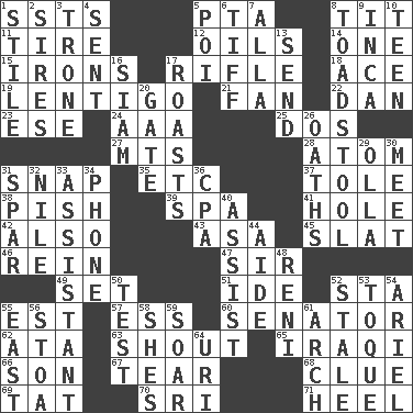 ACROSS 1. Fast planes 5. Parent Teacher Association (abbr.) 8. Teat (slang) 11. Become fatigued 12. Lubricates 14. Single 15. Removes the wrinkles 17. Ransack; plunder; pillage 18. Adept person 19. Small, flat, pigmented spot on the skin 21. Avid follower 22. Daniel's nick name 23. Compass dir. 24. Auto club (abbr.) 25. Two (Sp.) 27. Mountains (abbr.) 28. Smallest unit of an element 31. Fastener 35. And so on (abbr.) 37. Lacquered or enameled metalware 38. Expression of disdain 39. Health resort 41. Opening into or through something 42. In addition 43. White ___ sheet 45. Narrow board 46. It's straight from the horse's mouth 47. Title for a knight 49. Put into a specified state 51. Binary compound 52. R.R. building 55. Eastern Standard Time (abbr.) 57. Double-curved letter 60. Legislator 62. "One Day ___ Time" 63. Yell 65. Resident of Iraq 66. Male child 67. Pull apart 68. A slight indication 69. Make lace 70. Indian title of respect (Mr.) 71. The bottom of a shoe or boot DOWN 1. Vertical member of a panel or frame 2. Titles for men of rank and authority 3. Marketplace scale 4. Emitted 5. Luau course 6. Small quarrel 7. Silent film actress Nazimova 8. Inedible or poisonous agaric 9. South American Indian 10. Adolescent 13. Transmit 16. Thailand, formerly 17. Exposes to great heat 20. Yard entry 26. Expletives 29. Water jar 30. Rendezvous 31. Practice fight 32. "Death on the ____" 33. Aide 34. Give a jingle 36. Accounting whiz (abbr.) 40. Aid 44. Helper 48. Painter Guido (1575-1642) 50. Trial 52. Showing deterioration from age 53. Woman's close-fitting hat 54. Satellite of Uranus 55. Compass direction 56. Portico 58. "______ My Girl" (Turtles hit) 59. Fly high 61. Bowlike part 64. RI univ.