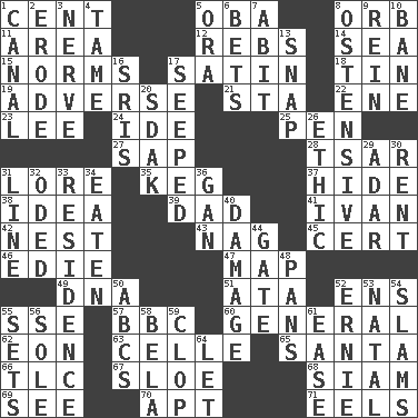 ACROSS 1. Penny 5. Chief or king in Benin or Nigeria 8. Globe 11. Type of rug 12. Confederate soldiers (slang) 14. Ocean 15. Typical models 17. Smooth fabric 18. Shallow baking pan 19. Contrary to your interests or welfare 21. R.R. building 22. Compass dir. 23. Area sheltered from the wind 24. Binary compound 25. Animal enclosure 27. Plant excrement 28. Russian ruler of old 31. Old wives' tales, e.g. 35. Cask 37. Flintstone garb 38. The content of cognition 39. Male parent 41. "Terrible" tsar 42. Egg locale 43. Tired old horse 45. Sure thing 46. Singer Brickell 47. Atlas unit 49. Heredity factor (abbr.) 51. "One Day ___ Time" 52. Followers of ems 55. Compass dir. 57. English channel? 60. Commissioned military rank 62. Period of immesurable duration 63. Cell (Danish) 65. Before Barbara or Clara 66. Affectionate concern, for short 67. A type of plum 68. Thailand, formerly 69. Observe 70. Fitting 71. Snakelike fish DOWN 1. Lessep's creation 2. Wear away 3. Effrontery 4. Not wild 5. Mouth or opening 6. Antes 7. "This won't hurt ____!" 8. Clearly or manifestly demonstrative 9. It's straight from the horse's mouth 10. Object of repulsion 13. Fastener 16. Indian titles of respect 17. Oozed 20. Neighbor of Neb. 26. Moral principle 29. The sixth month of the Jewish calendar 30. Monthly bill 31. Actor's bit 32. Wrote a lyric poem 33. Dwelling 34. Ingested 36. Separate the seeds from cotton 40. Break 44. Yard entry 48. Baking dishes 50. Lettered men learn these first 52. Bert's buddy 53. Relating to or accompanying birth 54. Shuts with force 55. Puts into a specified state 56. Not divided or shared with others 58. Actor Lugosi 59. Hoof sound 61. Relaxation 64. Allow