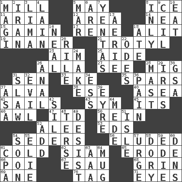ACROSS 1. Place where flour is made 5. Can I? 8. Frozen water 11. Roberta Peters solo 12. Length times width 14. Teachers' org. 15. Street urchin 17. French philosopher Descartes 18. Set down 19. More empty; more void 21. TNT 23. Direct toward a target or goal 25. Helper 26. Silent film actress Nazimova 27. Perceive with the eye 28. Russian fighter aircraft 31. Elected rep. 33. Supplement with great effort 35. Practice fights 37. Inventor's middle name 38. Compass dir. 40. At sea 41. Travels by water 43. Symbol (abbr.) 45. ___ a Wonderful Life 46. Leather borer 47. It would 50. It's straight from the horse's mouth 52. Toward shelter 53. Begley and Asner 54. Spring feasts 56. Dodged 61. Chilled 62. Thailand, formerly 65. Eat (away) 66. Luau course 67. Son of Isaac 68. Smile widely 69. One (Scot) 70. Label 71. Snake ____ (dice throw) DOWN 1. Wise men 2. SW Asia republic 3. Pale green bean 4. (Had) reclined 5. Third mo. 6. "We ___ not amused" (Victoria) 7. Gossips 8. Inwardly 9. To provide with a ceiling 10. Consume 13. Nest on high 16. Anneal 18. Had dinner 20. Cause heat under the collar 22. Lyric poems 24. Cause to be 26. Of or related to the anus 28. Vertical spar for supporting sails 29. Angers 30. Girls' org. (abbr.) 31. Cole _ (cabbage dish) 32. Tending to cause great harm 34. Curvy letter 36. Ache 37. White ___ sheet 39. Jane of fiction 42. Filth; sediment 44. Ancient Persian 48. Laconic 49. Cease 51. Small island 52. Find the sum of 54. Within a short period 55. Writer Wiesel 57. Goad 58. Dinghy 59. Singer Brickell 60. Habitations of wild animals 61. Tax preparer (abbr.) 63. Auto club (abbr.) 64. Java container