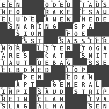 ACROSS 1. Car or cant ending 4. Wrote a lyric poem 8. Bits 12. Modern: prefix 13. Libertine 14. Son of Isaac 15. Evade 18. Afresh 19. Ancient Persian 20. Catching in a trap 22. Health resort 23. The Jewish people; Israel 24. Enemy 25. Fast jet (abbr.) 26. More impudent 30. And not 33. 61 cubic inches 36. Ancient Roman robe 37. Ancient Greek god of war 39. Feline 40. In a ____ (agitated or irritated) 41. Pulled tight 42. Debunk (Brit. slang) 44. Compass dir. 45. Shoved, as through a crowd 47. Chop off 50. Writing instrument 51. Dutch treat 53. Fitting 54. Commissioned military rank 57. Body of Kaffir warriors 59. Saudi Arabian king (1953-1964) 61. Empty completely 63. It's straight from the horse's mouth 64. Liveliness 65. Federal power corp. 66. Volcanic refuse 67. _ mater 68. Elected rep. DOWN 1. Compass dir. 2. Snakelike fish 3. Parts of speech 4. Northwest Algerian city 5. Mild oath, euphamism for damn 6. Supplement with great effort 7. Morning condensation 8. Storms 9. At sea 10. Male parent 11. Take to court 16. Raised platform 17. Greek god of love 21. International (abbr.) 22. Distress signal 24. At a great distance 26. Stalk of a moss capsule 27. Charged atoms 28. The front part of a cuirass 29. Pace 30. Nathan's nickname 31. Relating to the mouth 32. Reuben's nickname 34. On the rocks 35. Bar bill 38. Closing up, plugging up 42. Lair 43. Small, secluded valley 46. Dripping 48. Lyric poems 49. Role in a play 52. Shops 53. Capital of Western Samoa 54. Island territory of the United States 55. Pulitzer Prize-winning author Ferber 56. Not recorded 57. Big collection agency 58. Cartoonist voice _ Blanc 59. Ocean 60. Everything 62. Baking dish