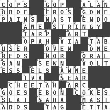 ACROSS 1. 911 reaches them 5. Republican Party 8. Actor Alda or Thicke 12. Mitch Miller's instrument 13. Greek god of love 15. Went 16. Aches 18. Political cartoonist Thomas 19. Inside; within (prefix) 20. One (Scot) 22. Slender, wiry 24. Canvas cover 26. Nonscientific branch of learning 27. Brightly colored fish 28. By way of 29. Bar bill 32. One who makes use of a thing 35. Baking chamber 37. Single 38. Vintage cars 39. Not either 40. Relating to the mouth 41. Separate the seeds from cotton 42. Stitched 43. Electrical Unit 44. Curvy letter 45. Raised railways 46. Singer Murray 49. Federal power corp. 50. Wither 51. Leopard's kin 55. Curve 56. Leaves 57. Inky black, to poets 59. Popular sodas 63. Narrow board 64. "Two Mules for Sister ____" 65. Vertical spar for supporting sails 66. Sums up 67. Label 68. Singer James DOWN 1. Police officer (slang) 2. Chief or king in Benin or Nigeria 3. Luau course 4. Elected representatives 5. Commissioned mil. rank 6. Mouths or openings 7. Mail 8. Rep 9. Having great length 10. "60 Minutes" Commentator Rooney 11. Modern: prefix 14. Put through a sieve 17. Fastener 21. Period 23. Lyricist Gershwin 25. Gives a jingle 28. Actresses Bloom and Felton 29. "Corrida" creature 30. Of or related to the anus 31. Waist strap 32. Goad 33. Oceans 34. Immeasurably long periods of time 36. Solemn pledge 40. Conquer 42. Chalkboards 45. Night before a holiday 47. Teachers' org. 48. Drug cop 49. Trials 51. Chilled 52. Froth on beer 53. Blind as ____ 54. Israeli folk dance 56. Girls' org. (abbr.) 58. Tired old horse 60. Krazy ___ of comics 61. Eastern Standard Time (abbr.) 62. R.R. building