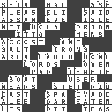 ACROSS 1. Stalk of a moss capsule 5. Actor Linden 8. Compass dir. 11. Entreaties 13. Connecticut Ivy Leaguer 14. Expressed in words 15. Indian state 16. Night before a holiday 17. Capri or Wight 18. Fish or hair follower 19. Southern CA. univ. 21. Constellation of myth 22. "Tell ____ the Marines!" 24. Not women's 25. Buttonhole 27. A saturated hydrocarbon 29. Table seasoning 30. Removes the wrinkles 32. Length times width 33. Having ears or earlike features 35. Dwelling 39. Domineers 41. Baking chamber 42. Writing tablet 43. Cylindrical with tapered ends 45. Water vessel 48. One who uses or employs something 49. Puts on (as clothing) 50. Proofreading order 52. To free from 55. Compass direction 56. Health resort 57. Elude 59. Toward shelter 60. Rowing implement 61. Eroded 62. French article 63. Baseball player Mel 64. Beverages made from leaves DOWN 1. Connect, as a bridge 2. Otherwise 3. One of the two male reproductive glands 4. American Automobile Association (abbr.) 5. Person who is morally reprehensible 6. Inventor's middle name 7. Falsehood 8. Indian antelope 9. Grain storage towers 10. Locale of original sin 12. Particles of soot 14. Beget 20. Small bed 21. Presage 23. "_____ Recall" 25. White ___ sheet 26. Auto 27. "We ___ not amused" (Victoria) 28. Lower and raise head in agreement 30. Big collection agency 31. Dinah or Pauly 33. Epoch 34. Say or write further 36. Make much ado about nothing 37. Was introduced to 38. Compass dir. 40. Chooses 43. Third day of the wk. 44. First name in cosmetics 45. Calif. Air Force Base 46. Fertile tracts in a desert 47. Johnson of "Laugh-In" 49. Welt 50. Petty quarrel 51. Small pie 53. The main thing one is thinking about 54. Habitations of wild animals 56. "Barney Miller" actor Jack 58. Large container