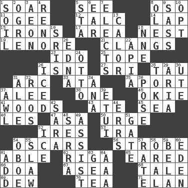 ACROSS 1. Fly high 5. Perceive with the eye 8. Bear (Spanish) 11. Double curve, resembling the letter S 12. Baby powder 14. Pet locale 15. Metal shackles 17. Type of rug 18. A home for chicks 19. Poe poem 21. Gives out a loud, resonant sound 23. Wedding promise 25. Drink excessively 26. Is not 27. Indian title of respect (Mr.) 28. The 19th letter of the Greek alphabet 31. Curve 33. _ moment's notice (2 wds.) 35. To the left, to Queeg 37. Toward shelter 38. Single 40. Migrant worker of the '30s 41. Forest 43. Had dinner 45. Ocean 46. French article 47. White ___ sheet 50. Goad 52. Angers 53. Retirement account (abbr.) 54. Motion picture awards 56. Disco prop 61. Competent 62. Capital of Latvia 65. Having ears or earlike features 66. ___ good deed 67. At sea 68. Lie 69. Morning condensation 70. Beverage made from leaves 71. Style DOWN 1. Earth 2. Legendary monster 3. A really long time 4. Western Nevada city 5. R.R. building 6. Ewer handle 7. Opts 8. Cassini of fashion 9. Backtalk 10. Choose 13. Bodily heat indicating an inflammation 16. Indian titles of respect 18. Compass dir. 20. Pulitzer Prize-winning author Ferber 22. Capital of Western Samoa 24. "Beetle Bailey" pooch 26. On the rocks 28. Puff or smoke 29. Operatic vocal solo 30. Shoshoni 31. _ vera 32. Vintage cars 34. Santa ___, CA 36. Introduce or present, as a question 37. Leather borer 39. Needle case 42. "Two Mules for Sister ____" 44. Blunders 48. Spanish missionary in California 49. Help 51. Yard entry 52. Frozen water 54. Mitch Miller's instrument 55. Cole _ (cabbage dish) 57. Pace 58. Taken by mouth 59. Actor Lugosi 60. Paradise 61. Say or write further 63. Unit of force equal to gravity 64. American Automobile Association (abbr.)