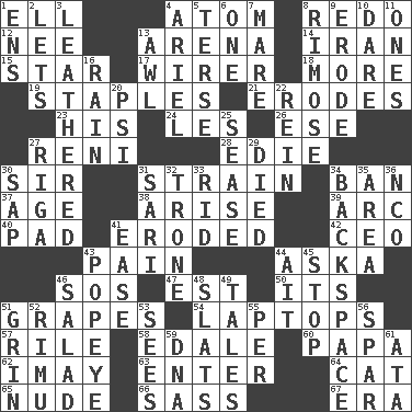 ACROSS 1. Pipe bend 4. Smallest unit of an element 8. Do over again 12. Born 13. Sports stadium 14. SW Asia republic 15. Play the lead 17. One who wires 18. Greater amount 19. Paper fasteners 21. Eats (away) 23. Part of HMS, perhaps 24. French article 26. Compass dir. 27. Painter Guido (1575-1642) 28. Singer Brickell 30. Title for a knight 31. Put through a sieve 34. Forbid 37. Personal question 38. Get up 39. Curve 40. Writing tablet 41. Eaten away 42. Corporate head (abbr.) 43. Ache 44. "____ silly question..." 46. Distress signal 47. Eastern Standard Time (abbr.) 50. ___ a Wonderful Life 51. Wine fruits 54. Portable computers 57. Cause heat under the collar 58. Peak District village in England 60. Dad 62. "If ____ say so..." 63. Keyboard key 64. Feline 65. Unadorned 66. Backtalk 67. Period DOWN 1. Followers of ems 2. Allows 3. Resembling or made to resemble leather 4. Satellite of Uranus 5. Laconic 6. Single 7. Female horse 8. Full of chinks, cracks, or crevices 9. Wear away 10. Have the gumption 11. Washington bills 13. Leather borer 16. Water falling in drops from the sky 20. Air pressure measure (abbr.) 22. It's straight from the horse's mouth 25. Gospel singer Marvin 27. Port city in Latvia 29. Passed on 30. Plant excrement 31. Indian skirt 32. Marketplace scale 33. To free from 34. Keyboard key 35. Type of rug 36. Non-commissioned officer (abbr.) 41. Comfort 43. Wimpy's pal 44. Small island 45. Discontinue 46. First course 48. Narrow boards 49. Lies 51. Broad smile 52. Tall New Zealand timber tree 53. Perceives with the eye 55. For each 56. Practice fight 59. Heredity factor (abbr.) 61. _ moment's notice (2 wds.)