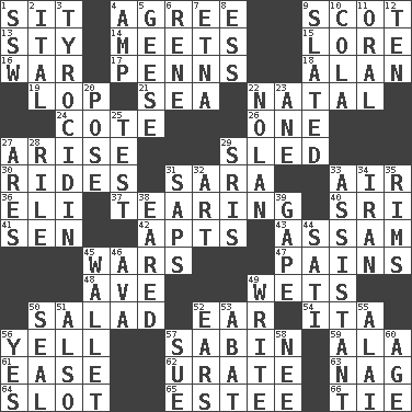 ACROSS 1. Be seated 4. Match 9. Highlander 13. Filthy place 14. Confronts 15. Old wives' tales, e.g. 16. Armed conflict 17. Actor Sean's family 18. Actor Alda or Thicke 19. Trim (branches) 21. Ocean 22. Brizilian seaport 24. ____ d'Azur (French Riviera) 26. Single 27. Originate 29. Downhill vehicle 30. Amusement-park features 31. "Two Mules for Sister ____" 33. Wind 36. Biblical high priest 37. Pulling apart 40. _ Lanka 41. Elected rep. 42. Tenement units (abbr.) 43. Indian state 45. Armed conflicts 47. Aches 48. "___ Maria" 49. Moistens 50. First course 52. Hearing organ 54. Call ___ day 56. Shout 57. Unit of acoustic absorption 59. Wing 61. Comfort 62. A salt of uric acid 63. Tired old horse 64. Notch 65. First name in cosmetics 66. Make a knot DOWN 1. Compass dir. 2. Slanted text style (abbr.) 3. Polypeptide antibiotic 4. Electrical Unit 5. Honkers 6. French philosopher Descartes 7. Inactive volcano in Sicily 8. Double-curved letter 9. Scheduled 10. Root beer relative 11. Taken by mouth 12. Nine, plus one 20. Airs 22. Pitcher Ryan 23. One (Scot) 25. Trial 27. Ancient Greek god of war 28. Cause heat under the collar 29. Indian titles of respect 31. Plant excrements 32. Tate display 33. Helper 34. SW Asia republic 35. Basketball hoops 38. Having ears or earlike features 39. Stare wonderingly 44. Suttee (variant) 45. Place for singles 46. Actress Gardner 49. Compose 50. Lick closed 51. In addition 52. Hearing organs 53. Blind as ____ 55. Jai _ 56. It is so 57. Take to court 58. Born 60. Grow older