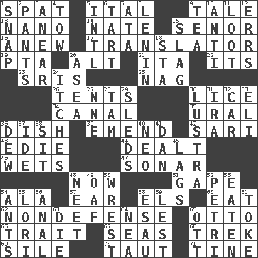 ACROSS 1. Petty quarrel 5. Slanted text style (abbr.) 9. Falsehood 13. Billionth: prefix 14. Nathan's nickname 15. Sir (Sp.) 16. Afresh 17. Interpreter 19. Parent Teacher Assoc. 20. Keyboard modifier key 21. Call ___ day 22. ___ a Wonderful Life 23. Indian titles of respect 25. Tired old horse 26. Portable shelters 30. Louse (plural) 34. Lessep's creation 35. Mountain range 36. Food container 39. Make improvements or corrections to 42. Indian skirt 43. Singer Brickell 44. Started a card game 46. Moistens 47. Echolocation 48. Cut the grass 51. Open wide 54. In the manner of 57. Ewer handle 58. Raised railways 60. Consume 62. Unrelated to defense, as in spending 65. "Beetle Bailey" pooch 66. Distinguishing feature 67. Oceans 68. Long journey 69. Drop; flow; fall 70. Pulled tight 71. Prong on a fork DOWN 1. Fastener 2. Leg coverings 3. Approach 4. Pull behind 5. International (abbr.) 6. Small pie 7. _ moment's notice (2 wds.) 8. Soviet premier 1918-24 9. Afternoon social gathering 10. Opposed to 11. Spoils 12. Blunders 15. Volcanic refuse 18. R.R. building 20. Toward the sea 24. Irritating cutaneous sensations 27. Compass dir. 28. Scottish cap 29. Bobsleighs 30. A period of five years 31. Retirement account (abbr.) 32. Automobile 33. Biblical high priest 36. Morning condensation 37. Binary compound 38. Be seated 40. Modern: prefix 41. Daniel's nick name 45. Straggles 48. Confront 49. Clumsy lout 50. Take or capture by force 52. _ dish (used to culture cells) 53. Eroded 54. Pismires 55. Australian parrot (variant) 56. Of or related to the anus 58. Son of Isaac 59. For fear that 61. Casino tip 63. Expire 64. Teachers' org. 65. Baseball player Mel