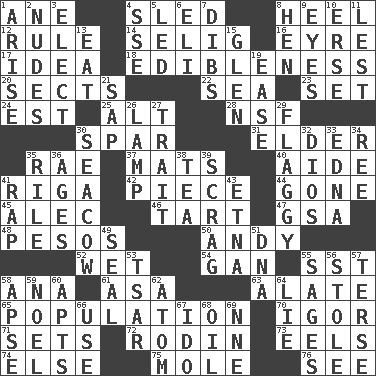 ACROSS 1. One (Scot) 4. Downhill vehicle 8. The bottom of a shoe or boot 12. Court order 14. Major League Baseball Commissioner Bud 16. Jane of fiction 17. It may be bright or harebrained 18. The property of being fit to eat 20. Religious groups 22. Ocean 23. Put into a specified state 24. Eastern Standard Time (abbr.) 25. Keyboard modifier key 28. Science/research agcy. 30. Coast Guard woman 31. A person who is older than you are 35. Actress Charlotte 37. Floor protectors 40. Assistant 41. Capital of Latvia 42. Part 44. Went 45. Actor Baldwin 46. Small pie 47. Girls' org. (abbr.) 48. Mexican monetary units 50. Actor Griffith 52. Soggy 54. Separate the seeds from cotton 55. Fast jet (abbr.) 58. Santa ___, CA 61. White ___ sheet 63. Having winglike extensions 65. Census information 70. Russian composer Stravinsky 71. Arranges properly for use 72. "The Thinker" sculptor 73. Snakelike fish 74. Otherwise 75. Undercover agent 76. Observe DOWN 1. Originate 2. Unclothed pictures 3. Voters do this 4. Compass dir. 5. Directed 6. Biblical high priest 7. Rights 8. Layer 9. Snake ____ (dice throw) 10. Celtic language 11. For fear that 13. Ingest 15. Small, secluded valley 19. Comfort 21. Plant excrement 26. Desk light 27. Distinguishing feature 29. Insipid 30. Manatee 32. "Vaya con ____" 33. Pulitzer Prize-winning author Ferber 34. To riddle 35. Cause heat under the collar 36. Matures 38. Beverage made from leaves 39. Lean end of the neck 41. Reproach for some lapse or misdeed 43. Inactive volcano in Sicily 49. Lick closed 51. Heredity factor (abbr.) 53. Russian ruler of old 55. Gurus 56. Fur scarf 57. Laconic 58. Domed church section 59. Christmas carol 60. Tenement units (abbr.) 62. Tiny particle 64. Falsehood 66. Purpose 67. Wedding promise 68. Petroleum 69. Compass dir.