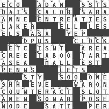 ACROSS 1. Environmental prefix 4. First man 8. Fast planes 12. Raised platform 14. Bodily heat indicating an inflammation 16. "Two Mules for Sister ____" 17. Singer Murray 18. Pleas 20. Member of a famous L.A. basketball team 22. Pipe bend 23. French article 24. Raised railways 25. White ___ sheet 28. Slangy assent 30. Musical composition 31. Timepiece 35. And so on (abbr.) 37. Is not 40. Type of rug 41. Algonquian 42. Off limits 44. Small pie 45. At sea 46. Shopping center 47. Eastern Standard Time (abbr.) 48. Actor Sean's family 50. Allows 52. Filthy place 54. "Barney Miller" actor Jack 55. Single 58. Quiet! 61. Night before a holiday 63. Make _____ (do battle with) 65. Frustrate 70. Position in a hierarchy or organization 71. So be it 72. Echolocation 73. Introduce or present, as a question 74. Thickened enlargement 75. Suttee (variant) 76. For each DOWN 1. Peak District village in England 2. Lessep's creation 3. Pig sounds 4. Adept person 5. One of the 12 tribes of Israel 6. Keyboard modifier key 7. Greater amount 8. Fast jet (abbr.) 9. Move on water 10. Woody plant 11. Backtalk 13. Observe 15. Have confidence or faith in 19. Actor Baldwin 21. Reproach for some lapse or misdeed 26. Set or collection 27. Indian state 29. Food holders 30. Seas 32. Mouths or openings 33. Sure thing 34. Krazy ___ of comics 35. Celtic language 36. Adolescent 38. Basketball assoc. 39. For Whom the Bell _____ 41. Head covering 43. Margarine 49. Proofreading order 51. Pull behind 53. Jacques Cousteau's middle name 55. Fourth or lowest deck 56. Trap for birds or small mammals 57. Keyboard key 58. Glance over 59. Same (prefix) 60. Took on color 62. Greek god of love 64. Viper 66. Compass dir. 67. Santa ___, CA 68. Feline 69. Three (prefix)