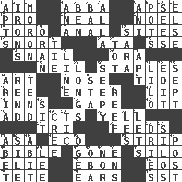 ACROSS 1. Direct toward a target or goal 4. Swedish rock group 8. Domed church section 12. Adept person 13. Actress Patricia 14. Christmas carol 15. "Corrida" creature 17. Of or related to the anus 18. Locates 19. Derisive sound 21. "One Day ___ Time" 23. Compass dir. 24. Slow-paced one 26. Mouth or opening 28. Famous astronaut Armstrong 30. Paper fasteners 34. Nonscientific branch of learning 37. Sense of smell 39. Event that recurs at intervals 40. To sift 41. Keyboard key 43. Mouth edge 44. Restaurants 46. Open wide 47. Baseball player Mel 48. Inveterate users 51. Shout 54. Three (prefix) 55. Eats 58. White ___ sheet 61. Environmental prefix 63. Remove all contents or possession from 65. The Good Book 67. Went 71. Grain storage tower 72. Writer Wiesel 73. Inky black, to poets 74. Greek goddess of the dawn 75. False hair 76. Hearing organs 77. Fast jet (abbr.) DOWN 1. Tenement units (abbr.) 2. Metal shackles 3. Person of subnormal intelligence 4. Santa ___, CA 5. Benjamin's nick name 6. Sound made by sheep 7. Silent film actress Nazimova 8. Black tropical American cuckoo 9. Cooking vessels 10. Perceives with the eye 11. Otherwise 16. NW Algerian seaport 18. "Two Mules for Sister ____" 20. Make a knot 22. Small child 25. Actor's bit 27. Fitting 29. Yearns 30. Not well drained, as in land 31. _ and Stitch 32. Prepare for publication 33. Back-to-school mo. 34. Operatic vocal solo 35. Tear apart 36. Look after 38. R.R. building 42. Coral collection 45. Be seated 49. Algonquian 50. Nervous spasm 52. French article 53. Allows 56. Frees from moisture 57. Grain storage towers 58. Collude with 59. Drop; flow; fall 60. "This won't hurt ____!" 62. Double curve, resembling the letter S 64. Mail 66. Area sheltered from the wind 68. Chief or king in Benin or Nigeria 69. Not either 70. Followers of ems