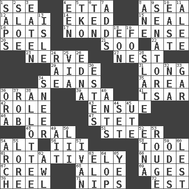 ACROSS 1. Compass dir. 4. Singer James 8. Toward the sea 12. Mountain range southwest of Kyrgyzstan 14. Supplemented with great effort 15. Anneal 16. Plant holders 17. Unrelated to defense, as in spending 20. Stitch closed the eyes of (a falcon) 21. "Barney Miller" actor Jack 22. Had dinner 23. Boldness 27. A home for chicks 29. Helper 31. Having great length 34. Actors Connery and Penn 35. Length times width 36. NW Algerian seaport 39. "One Day ___ Time" 41. Russian ruler of old 42. Hero or heavy, e.g. 43. Take place subsequently 46. Competent 47. Proofreading order 48. Taken by mouth 51. Bull 54. Keyboard modifier key 56. One more than two 58. Utensil 61. Happening in regular succession 66. Unadorned 67. Group working together 68. _ vera 69. Ripens 70. Person who is morally reprehensible 71. Cuts off 72. Eastern Standard Time (abbr.) DOWN 1. Plant excrements 2. _ gin 3. Eroded 4. Car or cant ending 5. Ring climax 6. Nine, plus one 7. Sums up 8. A saturated hydrocarbon 9. Elected representatives 10. 90 degrees 11. Toward shelter 13. Capri or Wight 18. Period of immesurable duration 19. Enemy 24. Actress Charlotte 25. By way of 26. Pulitzer Prize-winning author Ferber 28. Schedule 30. _____ Park, CO 32. Teachers' org. 33. Slender fish 34. Contemptuous expression 36. Mouth or opening 37. Director Reiner 38. One to whom something is allotted 40. Pismires 44. Put into a specified state 45. Shoshoni 49. Small island 50. Cards in a Roman deck? 52. Inactive volcano in Sicily 53. Makeup applied to the cheeks 54. Bowlike part 55. Old wives' tales, e.g. 57. _ the terrible 59. Lyric poems 60. For fear that 62. Leather borer 63. Biblical high priest 64. Chop off 65. Affirmative reply