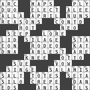 ACROSS 1. Curve 4. Atlas contents 8. Strand of rope, yarn or thread 11. Superhero pair 12. Choose 14. Toward shelter 15. Silent film actress Nazimova 17. Showery time 18. Religious women 19. Thinks logically 21. Continued (abbr.) 23. Being at a high temperature 24. Modern: prefix 25. Ooze 27. Old wives' tales, e.g. 30. Flaplike covering 31. Fodder prepared in a silo 34. R.R. building 37. A really long time 38. Cowboy competition 39. Krazy ___ of comics 40. Heredity factor (abbr.) 41. Most capable 43. "We ___ not amused" (Victoria) 44. Leg joint 45. Von Bismarck 47. Institute legal proceedings 49. Solemn pledge 50. Burn superficially 52. Deli grouping 56. Table seasoning 57. Hauls 60. Stalk of a moss capsule 61. Grain storage tower 62. Streamer paper 63. Daniel's nick name 64. Begley and Asner 65. Pismires 66. Raised railways DOWN 1. The sixth month of the Jewish calendar 2. Court order 3. Root beer relative 4. Intended 5. High mountains 6. For each 7. _-fi 8. Mickey's pet 9. Grant temporary use of 10. Affirmative reply 13. Affectionate concern, for short 14. Queen of England 1702-14 16. American tennis player Robert 20. I made a mistake 22. Single 25. The Jewish people; Israel 26. Pulitzer Prize-winning author Ferber 27. Dipping utensil 28. Double curve, resembling the letter S 29. Vintage cars 30. Directed 32. SW Asia republic 33. Ear part 34. Three-handed card game 35. Edible starchy tuberous root 36. Had dinner 42. Implement 44. Cask 46. It was, poetically 47. Beverly of Met fame 48. To (old English) 49. Flower holders 50. Alleged 51. And so on (abbr.) 52. Back-to-school mo. 53. Ancient Persian 54. Slanted text style (abbr.) 55. Without 56. Compass dir. 58. Mouth or opening 59. "___ Little Indians"