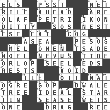 ACROSS 1. Raised railways 4. Inconspicuous attention getter 8. Was introduced to 11. Cause heat under the collar 13. Toward the future 15. "We ___ not amused" (Victoria) 16. Norwegian king 17. _ dish (used to culture cells) 18. Picture 19. Short, simple song 21. Mayday 22. A home for chicks 23. Compass dir. 24. Ingest 27. Gear tooth 29. At sea 30. Mexican monetary units 34. Cartoonist voice _ Blanc 36. Presage 39. Sadhe (variant) 40. Christmas carol 41. Congenital growth or mark on the skin 43. Event that recurs at intervals 44. Lowest deck of a ship 46. Stitch closed the eyes of (a falcon) 47. Begley and Asner 48. Musical pauses 49. Nothingness 51. Neckwear 53. Baseball player Mel 54. Floor covering 57. Legendary monster 60. Grand Old Party 63. A sleeping potion; an opiate (poet.) 65. Relationship diagram 66. Standard of perfection 69. Play the lead 70. Metal container 71. Gospel singer Marvin 72. Moistens 73. Single 74. To draw with force 75. To riddle DOWN 1. Eat (away) 2. Ms. Damita and namesakes 3. Chalkboard 4. Infant food 5. A female animal or person 6. Arranges properly for use 7. Pacific island yam 8. Cause to be 9. Greek god of love 10. Portable shelter 12. Newt 14. Plate 18. Consumed 20. Consenting reply 25. A really long time 26. Makes less strong or intense 28. Elect 29. One to whom something is allotted 31. Alleged 32. Likelihood 33. Observe 34. Greater amount 35. Snakelike fish 37. Night before a holiday 38. New (sp.) 40. Not either 42. Narrow opening 45. 23rd letter of the Greek alphabet 50. It would 52. The front part of a cuirass 54. Mother 55. Having winglike extensions 56. Laconic 57. Von Bismarck 58. Amused look 59. French philosopher Descartes 61. Wrote a lyric poem 62. Lightbulb-shaped fruit 64. Compass dir. 67. White ___ sheet 68. Part of a journey