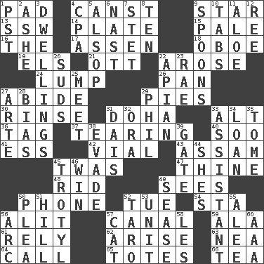 ACROSS 1. Writing tablet 4. 2nd pers. sing. pres. of can (arch.) 9. Play the lead 13. Compass dir. 14. Food holder 15. Light colored 16. Definite Article 17. NE Netherlands city 18. Mitch Miller's instrument 19. Raised railways 21. Baseball player Mel 22. Came up 24. Mass 26. Baking dish 27. Tolerate 29. Sliced desserts 30. Wash lightly 31. Capital of the state of Qatar 33. The first octave above the treble staff 36. Label 37. Pulling into pieces 40. "Barney Miller" actor Jack 41. Curvy letter 42. Small bottle 43. Indian state 45. It was, poetically 47. One or ones belonging to thee 48. To free from 49. Observes 50. Give a jingle 52. Third day of the wk. 54. R.R. building 56. Came down and settled, as after flight 57. Lessep's creation 59. According to 61. Have trust in 62. Get up 63. Teachers' org. 64. Give a ring to 65. Lugs 66. Beverage made from leaves DOWN 1. Pacific Standard Time (abbr.) 2. American tennis player Robert 3. Residences 4. Accounting whiz (abbr.) 5. Columnist Joseph or Stewart 6. Political cartoonist Thomas 7. Proofreading order 8. Nine, plus one 9. Soup utensils 10. Bar bills 11. Medicinal plant 12. Portuguese money of account (variant) 20. Beer foam 22. Bee-related 23. Actress Charlotte 25. Confront 27. Johnson of "Laugh-In" 28. Prejudice 29. Silvers or Donahue 31. Raised platform 32. Mouth or opening 33. Aide 34. Grant temporary use of 35. Heavy book 38. Dodge 39. Yard entry 44. "______ My Girl" (Turtles hit) 45. Trinitrotoluene 46. Acquire through effort 49. Gospel singer Marvin 50. Entreaty 51. Land elevation 52. Edible starchy tuberous root 53. A single undivided whole 55. Toward shelter 56. Curve 57. Domesticated feline 58. French article 60. American Automobile Association (abbr.)