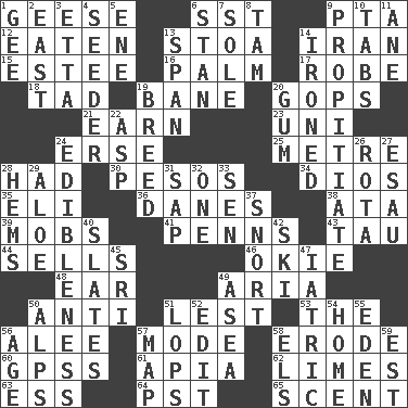 ACROSS 1. Honkers 6. Fast jet (abbr.) 9. Parent Teacher Assoc. 12. Ingested 13. Portico 14. SW Asia republic 15. First name in cosmetics 16. Inside of hand 17. Loose flowing garment 18. Small amount or degree 19. Object of repulsion 20. Republicans 21. Merit 23. University (slang) 24. Celtic language 25. Distance measurement (Brit.) 28. Possessed 30. Mexican monetary units 34. "Vaya con ____" 35. Connecticut Ivy Leaguer 36. Natives or inhabitants of Denmark 38. _ moment's notice (2 wds.) 39. Crowds into 41. Actor Sean's family 43. The 19th letter of the Greek alphabet 44. Makes a sale 46. Migrant worker of the '30s 48. Ewer handle 49. Roberta Peters solo 50. Against 51. For fear that 53. Definite Article 56. Toward shelter 57. Method 58. Eat (away) 60. Global Positioning Systems (abbr.) 61. Capital of Western Samoa 62. Citrus fruits 63. Double-curved letter 64. Pacific Standard Time (abbr.) 65. Odor DOWN 1. Unit of force equal to gravity 2. Compass direction 3. Singer James 4. Sowing specialist 5. Compass dir. 6. Comedian Laurel of Laurel & Hardy 7. Flatfish 8. Scottish cap 9. Conciliate 10. Bar bills 11. One (Scot) 13. Connect, as a bridge 14. Pressed 19. A special lineage 20. Chewing product 22. Viper 24. The property of being fit to eat 26. Roll call or roster of names 27. He sold his birthright 28. Equivocates 29. _ vera 31. Plant excrement 32. Single 33. Elected rep. 37. Derisive sound 40. Chalkboards 42. What Jean-Claude Killy likes to do 45. Indian title of respect (Mr.) 47. Of or pertaining to medicine 49. Toward the sea 50. High mountains 51. Chops off 52. Prepare for publication 54. Dwelling 55. Paradise 56. Grow older 57. Atlas unit 58. Raised railways 59. Eastern Standard Time (abbr.)