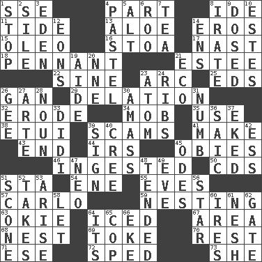 ACROSS 1. Compass dir. 4. Role in a play 8. Binary compound 11. Event that recurs at intervals 13. Medicinal plant 14. Greek god of love 15. Butter sub 16. Portico 17. Political cartoonist Thomas 18. Pre-World Series prize 21. First name in cosmetics 22. Trig term 23. Curve 25. Begley and Asner 26. Separate the seeds from cotton 29. Accusation by an informer 32. Eat (away) 34. Disorderly crowd 35. Purpose 38. Needle case 39. Fraudulent business schemes 41. Cause to be 43. Conclude 44. Big collection agency 45. Off-Broadway awards 46. Consumed 50. Music discs 51. R.R. building 54. Compass dir. 55. Nights before holidays 57. Monte _, Las Vegas Hotel/Casino 59. Nestling 63. Migrant worker of the '30s 64. On the rocks 67. Type of rug 68. Egg locale 69. Casino tip 70. Take ten 71. Compass dir. 72. Broke a traffic law 73. A female animal or person DOWN 1. Constrict 2. Filth; sediment 3. Genesis locale 4. Soft color 5. Keyboard modifier key 6. Friend of Pooh 7. Beverage made from leaves 8. Feeling or showing extreme anger 9. Administered medicine 10. _____ Park, CO 12. Immeasurably long periods of time 14. Followers of ems 19. Helper 20. Compass dir. 21. Environmental prefix 23. Smallest unit of an element 24. Chest bones 26. Turn to the right 27. Johnson of "Laugh-In" 28. Part of speech 30. Collect or gather 31. Unfeeling 33. "You Light Up My Life" star Conn 36. Ketch in the Levant 37. Supplemented with great effort 39. Omen 40. Algonquian 42. Curvy letter 45. Lyric poems 47. Modern: prefix 48. Looked after 49. Night before a holiday 51. Biscuitlike quick bread 52. Receives possession of 53. Originate 56. Play the lead 58. Allow 60. Angers 61. Tender 62. Yard entry 64. ___ a Wonderful Life 65. Police officer (slang) 66. Make supply last