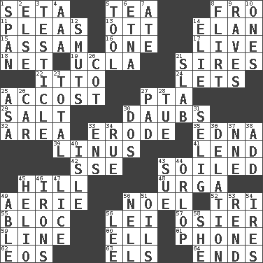 ACROSS 1. Stalk of a moss capsule 5. Afternoon social gathering 8. From 11. Entreaties 13. Baseball player Mel 14. Liveliness 15. Indian state 16. Single 17. Moving, as bait 18. Fish or hair follower 19. Southern CA. univ. 21. Fathers 22. "Tell ____ the Marines!" 24. Allows 25. Buttonhole 27. Parent Teacher Assoc. 29. Table seasoning 30. Applies to a surface 32. Type of rug 33. Eat (away) 35. Pulitzer Prize-winning author Ferber 39. "_ and Lucy" (Charlie Brown theme song) 41. Grant temporary use of 42. Compass dir. 43. Dirtied 45. Land elevation 48. Capital and largest city of Mongolia 49. Nest on high 50. Christmas carol 52. Three (prefix) 55. Alliance 56. Flowery wreath 57. Flexible twig of a willow tree 59. Actor's bit 60. Pipe bend 61. Give a jingle 62. Greek goddess of the dawn 63. Raised railways 64. Conclusions DOWN 1. Connect, as a bridge 2. Otherwise 3. A testis 4. American Automobile Association (abbr.) 5. Instrument 6. Inactive volcano in Sicily 7. Had dinner 8. Talk or behave amorously 9. All-night dance parties 10. Washington bills 12. Obscenities 14. Writer Wiesel 20. Small bed 21. Thick slice 23. "_____ Recall" 25. White ___ sheet 26. Auto 27. Writing tablet 28. Third day of the wk. 30. Two (Sp.) 31. Former Milwaukee Brewers owner Bud 33. Followers of ems 34. Regret 36. Conveyance 37. Compass dir. 38. Say or write further 40. Small island 43. Institute legal proceedings 44. Lowest deck of a ship 45. Sun: prefix 46. Removes the wrinkles 47. Louse (plural) 49. Competent 50. 1994 drama film starring Jodie Foster 51. Lubricates 53. Tear apart 54. Angers 56. Area sheltered from the wind 58. A female animal or person
