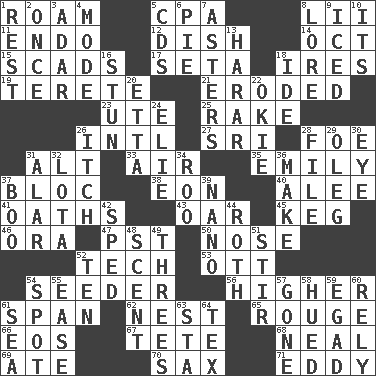 ACROSS 1. Wander aimlessly 5. Tax preparer (abbr.) 8. Cards in a Roman deck? 11. Inside; within (prefix) 12. Food container 14. Sep. follower 15. Tons 17. Stalk of a moss capsule 18. Angers 19. Cylindrical with tapered ends 21. Eaten away 23. Shoshoni 25. Immoral or dissolute person 26. International (abbr.) 27. _ Lanka 28. Enemy 31. The first octave above the treble staff 33. Wind 35. Poet Dickinson 37. Alliance 38. A really long time 40. Toward shelter 41. Curses 43. Rowing implement 45. Barrel 46. Mouth or opening 47. Pacific Standard Time (abbr.) 50. Characteristic smell of wine 52. Technology 53. Baseball player Mel 54. Sowing specialist 56. Having greater elevation 61. Connect, as a bridge 62. Egg locale 65. Makeup applied to the cheeks 66. Greek goddess of the dawn 67. False hair 68. Anneal 69. Had dinner 70. Saxophone 71. Whirlpool DOWN 1. Remainder 2. At one time in the past 3. The sixth month of the Jewish calendar 4. Method 5. Music discs 6. Sliced dessert 7. Michaelmas daisies 8. Old wives' tales, e.g. 9. On the rocks 10. It is 13. Ethiopian city, capital of Harari 16. Surprise greatly 18. Binary compound 20. Singer James 22. Migrant worker of the '30s 24. Writer Wiesel 26. Hankering 28. Do some clerical work 29. Cassini of fashion 30. Sight organ 31. Having or resembling wings 32. Globular water bottle used in Asia 34. Friend of Pooh 36. Cause to be 37. Oct. 31 cry 39. Billionth: prefix 42. Broke a traffic law 44. Writer of Portnoy's Complaint (1969) 48. Aroma 49. Threesomes 51. Disorderly outburst 52. "___ Little Indians" 54. Blemish 55. Comfort 57. Went 58. Became colored 59. Mild oath 60. Depend 61. Ocean 63. R.R. building 64. John Ritter's dad