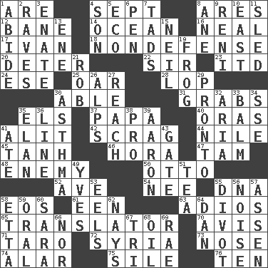 ACROSS 1. "We ___ not amused" (Victoria) 4. Back-to-school mo. 8. Ancient Greek god of war 12. Object of repulsion 14. Sea 16. Actress Patricia 17. _ the terrible 18. Unrelated to defense, as in spending 20. Prevent from occurring 22. Title for a knight 23. It would 24. Compass dir. 25. Rowing implement 28. Chop off 30. Competent 31. Takes hold of 35. Raised railways 37. Dad 40. Mouths or openings 41. Set down 42. Lean end of the neck 44. "Death on the ____" 45. Hyperbolic tangent 46. Israeli folk dance 47. Scottish cap 48. Foe 50. "Beetle Bailey" pooch 52. "___ Maria" 54. Born 55. Heredity factor (abbr.) 58. Greek goddess of the dawn 61. Car or cant ending 63. Goodbye (Sp.) 65. Interpreter 70. Deliberation 71. Pacific island yam 72. Damascus' land 73. Sense of smell 74. Having or resembling wings 75. Filth; sediment 76. "___ Little Indians" DOWN 1. Remain 2. All-night dance parties 3. Maternal 4. Boy, to dad 5. Environmental prefix 6. Animal enclosure 7. Small boys 8. A saturated hydrocarbon 9. Painter Guido (1575-1642) 10. Compass direction 11. Downhill vehicle 13. Compass dir. 15. Famous astronaut Armstrong 19. Toadlike animal 21. Director Reiner 26. High mountains 27. Arrive at 29. Right away 30. Respiratory problem 32. Operatic vocal solo 33. Lip ointment 34. Compass dir. 35. Liveliness 36. Actor's bit 38. Adept person 39. Composer Copland 41. Had dinner 43. Yard entry 49. Jacques Cousteau's middle name 51. Afternoon social gathering 53. Snakelike fish 55. A piece of turf (Scot.) 56. Annoying sound 57. NE Netherlands city 58. Singer James 59. Spoken 60. "Two Mules for Sister ____" 62. Negative votes 64. One of the 12 tribes of Israel 66. Not either 67. Three (prefix) 68. Lubricate 69. Actress Charlotte