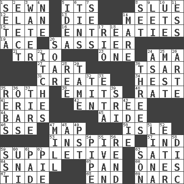 ACROSS 1. Stitched 5. It is 8. Change direction abruptly 12. Style 13. Pass on 14. Confronts 15. False hair 16. Pleas 19. Adept person 20. More lively and spirited 21. Musical group of three 23. Single 24. Housemaid (var.) 27. Small pie 30. Russian ruler of old 31. Make 34. Behest 35. Writer of Portnoy's Complaint (1969) 38. Gives off 40. Pace 41. 4th largest of the Great Lakes 42. Main course 44. Long, evenly shaped pieces 45. Helper 46. Compass dir. 47. Atlas unit 50. Small island 53. Motivate 57. Indiana (abbr.) 59. Supplementary 63. Suttee (variant) 64. Slow-paced one 65. Baking dish 66. Singles 67. Event that recurs at intervals 68. Conclusion 69. Drug cop DOWN 1. Bristle 2. Choose 3. Wetness 4. Compass dir. 5. It may be bright or harebrained 6. Metal containers 7. Arranges properly for use 8. Put into a specified state 9. Flowery wreath 10. Shoshoni 11. Curvy letter 14. Female horse 17. _ de Janeiro 18. Car or cant ending 20. Fly high 22. Skin irritations 24. At sea 25. Vertical spar for supporting sails 26. Johnson of "Laugh-In" 28. To riddle 29. Docile 30. Triplets 32. Metal container 33. Singer James 35. Confederate soldiers (slang) 36. Mouths or openings 37. Hoop that covers a wheel 39. Indian title of respect (Mr.) 43. Singer Brickell 47. Place where flour is made 48. One (Scot) 49. Pacific Standard Time (abbr.) 51. Climbing, woody, usually tropical vines 52. Keyboard key 54. Corncob 55. _ the terrible 56. Tear apart 58. Plate 59. Fast jet (abbr.) 60. University (slang) 61. Groovy apt. 62. Sliced dessert 63. Boy, to dad