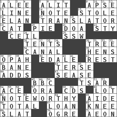ACROSS 1. Toward shelter 5. Came down and settled, as after flight 9. Domed church section 13. Actor's bit 14. Make mention of 15. Took without asking 16. Flair 17. Interpreter 19. Domesticated feline 20. Sliced dessert 21. ___ good deed 22. Filthy place 23. To provide with a ceiling 25. Compass dir. 26. Portable shelters 30. Woody plant 34. Lessep's creation 35. Coop moms 36. Brightly colored fish 39. Peak District village in England 42. Take ten 43. Object of repulsion 44. Laconic 46. Sums up 47. Gospel singer Marvin 48. English channel? 51. Russian ruler of old 54. Adept person 57. Mouth or opening 58. Music discs 60. Car dealer's back yard 62. Music shop? 65. Helper 66. Add up to 67. Grant temporary use of 68. Leg joint 69. Narrow board 70. Legendary monster 71. A really long time DOWN 1. Actor Baldwin 2. Pale purple color 3. Maternal 4. Car or cant ending 5. Against 6. Old wives' tales, e.g. 7. Call ___ day 8. Looks after 9. "One Day ___ Time" 10. Cooking vessels 11. Slit 12. Suggestive of the supernatural 15. Cole _ (cabbage dish) 18. Distress signal 20. Entreaty 24. Strong, restless desires 27. Compass dir. 28. Small boy 29. Narrow boards 30. Triads 31. To sift 32. Followers of ems 33. Eastern Standard Time (abbr.) 36. Chief or king in Benin or Nigeria 37. Writing tablet 38. Also 40. Area sheltered from the wind 41. Period 45. Fast planes 48. Soup holder 49. Sis' sibling 50. Monte _, Las Vegas Hotel/Casino 52. Place in a line 53. Cowboy competition 54. Pismires 55. Calm and collected 56. Singer James 58. Burn to charcoal 59. Centimeter-gram-second unit of force 61. Adolescent 63. Ingest 64. Coat; cloak 65. Alias (abbr.)