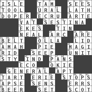 ACROSS 1. Small island 5. Scottish cap 8. Observes 12. Implement 13. Mountain range 15. Thin strip of wood or metal 16. Drug addict 18. Shade of tan 19. Johnson of "Laugh-In" 20. Large container 22. French poetic form 24. Supplements with great effort 26. Metal container 27. Be tempered by heat 28. Curve 29. "We ___ not amused" (Victoria) 32. Waist strap 35. Water jar 37. Flaplike covering 38. Wet nurse 39. Sliced dessert 40. Wise men 41. To free from 42. Ooze 43. A single undivided whole 44. Filthy place 45. Indiana (abbr.) 46. Baking dishes 49. Environmental prefix 50. Migrant worker of the '30s 51. Commissioned military rank 55. Fitting 56. Small pie 57. 4th largest of the Great Lakes 59. Halts 63. Domed church section 64. Elected reps. 65. Blunders 66. Fermented drink made from hops 67. Put into a specified state 68. Native of Scotland DOWN 1. It would 2. "Barney Miller" actor Jack 3. Chop off 4. Veterans Day date 5. Third day of the wk. 6. Curves 7. Female horse 8. Killed 9. Merit 10. Singer James 11. A female animal or person 14. A period of five years 17. Libertine 21. Beverage made from leaves 23. Nervous spasm 25. Inclined 28. City in Syria 29. Actor Alda or Thicke 30. Swiss mountan, "Queen of the Mountains" 31. Prepare for publication 32. Taverns 33. Give off 34. Kenny Rogers chart-topper in '80 36. Whopper 40. French bagpipes 42. Sounds asleep 45. Frozen water 47. Alias (abbr.) 48. Cuts off 49. Keyboard key 51. Yawn 52. Celtic language 53. Ancient Greek god of war 54. Actor's bit 56. Bar bill 58. Eastern Standard Time (abbr.) 60. The grampus (Milton) 61. Adept person 62. Fast jet (abbr.)