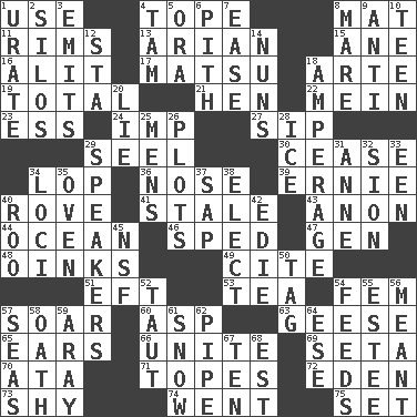 ACROSS 1. Purpose 4. Drink excessively 8. Floor covering 11. Basketball hoops 13. Believer in; advocate of (suffix) 15. One (Scot) 16. Came down and settled, as after flight 17. Taiwanese island in East China Sea 18. Johnson of "Laugh-In" 19. "_____ Recall" 21. Layer 22. Chow _ 23. Double-curved letter 24. Mischievous child 27. Small drink 29. Sew up the eyelids of hawks and falcons 30. Stop 34. Trim (branches) 36. Olfactory organ 39. Bert's buddy 40. Be footloose 41. Lacking originality or spontaneity 43. At once, immediately (arch.) 44. Sea 46. Drove too fast 47. Commissioned mil. rank 48. Pig sounds 49. Quote 51. Bank Draft (abbr.) 53. Beverage made from leaves 54. Opposite of masc. 57. Fly high 60. Viper 63. Honkers 65. Hearing organs 66. Join together 69. Stalk of a moss capsule 70. _ moment's notice (2 wds.) 71. Drinks excessively 72. Locale of original sin 73. Like a shrinking violet 74. Left 75. Put into a specified state DOWN 1. A salt of uric acid 2. Grain storage towers 3. Sends forth 4. Scottish cap 5. Mouth or opening 6. Essential or central part 7. Relaxation 8. Female horse 9. Opposed to 10. Adolescent 12. R.R. building 14. Religious women 18. Electrical Measurement 20. Untruth 25. Not women's 26. Small pieces of grounds 28. Frozen water 29. Orators 31. Singer Murray 32. The Jewish people; Israel 33. Car or cant ending 34. Venues 35. Baking chamber 37. Plant excrement 38. Opt 40. Friend of Pooh 42. Singer Brickell 45. Overdraft (abbr.) 50. Label 52. Pulled tight 54. Eats 55. First name in cosmetics 56. Intended 57. Oceans 58. Pledge 59. Like ___ of sunshine 61. Frozen precipitation 62. Corncob 64. Compass dir. 67. Nine, plus one 68. Eastern Standard Time (abbr.)
