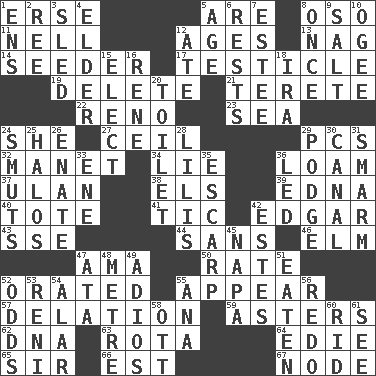 ACROSS 1. Celtic language 5. "We ___ not amused" (Victoria) 8. Bear (Spanish) 11. 1994 drama film starring Jodie Foster 12. Matures 13. Tired old horse 14. Sowing specialist 17. One of the two male reproductive glands 19. Keyboard key 21. Cigar-shaped 22. Former U.S. Attorney General Janet 23. Ocean 24. A female animal or person 27. To provide with a ceiling 29. Personal Computers (abbr.) 32. French painter Edouard 34. Falsehood 36. Rich soil 37. ____ Bator 38. Raised railways 39. Pulitzer Prize-winning author Ferber 40. Carryall 41. Nervous spasm 42. _ Allan Poe 43. Compass dir. 44. Without 46. Shade tree 47. Nursemaid (var.) 50. Assign a rank or rating to 52. Declaimed 55. Become visible 57. Accusation by an informer 59. Michaelmas daisies 62. Heredity factor (abbr.) 63. Roll call or roster of names 64. Singer Brickell 65. Title for a knight 66. Eastern Standard Time (abbr.) 67. Thickened enlargement DOWN 1. Followers of ems 2. To sift 3. Downhill vehicle 4. A person who is older than you are 5. Mature 6. Musical pauses 7. First name in cosmetics 8. At one time in the past 9. Table seasoning 10. Double curve, resembling the letter S 12. Had dinner 15. Voters do this 16. French philosopher Descartes 18. Retirement account (abbr.) 20. Rest room 24. Particles of soot 25. Rings 26. Maternal 28. Ms. Damita and namesakes 29. Puddle 30. Lessep's creation 31. Excessive but superficial compliments 33. Compass dir. 35. Fortification 36. Directed 42. _____ Park, CO 45. California wine valley 47. _ moment's notice (2 wds.) 48. Distance measurement (Brit.) 49. Goodbye (Sp.) 51. Ingested 52. Likelihood 53. Painter Guido (1575-1642) 54. Having or resembling wings 55. Santa ___, CA 56. Do over again 58. Baseball player Mel 60. To free from 61. Observe