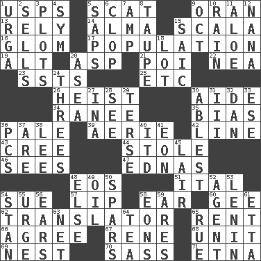 ACROSS 1. United States Postal Service (abbr.) 5. Scram! 9. NW Algerian seaport 13. Depend 14. _ mater 15. Any of the three canals of the cochlea 16. Take by theft 17. Census information 19. The first octave above the treble staff 20. Viper 21. Luau course 22. Teachers' org. 23. Fast planes 25. And so on (abbr.) 26. Robbery 30. Helper 34. Indian princess (variant) 35. Prejudice 36. Diluted with white 39. Nest on high 42. Actor's bit 43. Algonquian 44. Fur scarf 46. Observes 47. Ferber et al. 48. Greek goddess of the dawn 51. Slanted text style (abbr.) 54. Take to court 57. Mouth edge 58. Ewer handle 60. Unit of force equal to gravity 62. Interpreter 65. Monthly bill 66. Match 67. French philosopher Descartes 68. A single undivided whole 69. A home for chicks 70. Backtalk 71. Inactive volcano in Sicily DOWN 1. Capital and largest city of Mongolia 2. Makes a sale 3. Ground plans 4. Symbol (abbr.) 5. Plant excrements 6. Hoof sound 7. Electrical Unit 8. Grayish beige 9. Sep. follower 10. Water falling in drops from the sky 11. Medicinal plant 12. Grandmother 15. Ketch in the Levant 18. Car dealer's back yard 20. At sea 24. Triads 27. _ tizzy (2 wds.) 28. Observe 29. Laconic 30. Most capable 31. One more than two 32. One of the 12 tribes of Israel 33. Compass dir. 36. Personal Computers (abbr.) 37. "We ___ not amused" (Victoria) 38. Area sheltered from the wind 40. It would 41. Period of immesurable duration 45. Den 48. Otherwise 49. Lubricate 50. Practice fights 52. Rep 53. Soviet premier 1918-24 54. Comedian Laurel of Laurel & Hardy 55. Goad 56. Hearing organs 58. Immeasurably long periods of time 59. Ancient Greek god of war 61. Singer James 63. Remaining after all deductions 64. Beverage made from leaves 65. Sorrow