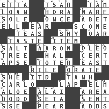 ACROSS 1. Singer James 5. Russian ruler of old 9. Scottish cap 12. Grant temporary use of 13. Israeli folk dance 14. Female horse 15. Flatfish 16. At one time in the past 17. Collude with 18. Pipe bend 19. Ewer handle 21. Biscuitlike quick bread 22. Afternoon social gatherings 24. Like a shrinking violet 26. Rowing implement 27. Clothes sense 28. A distinct part 29. Table seasoning 30. Composer Copland 32. Butter sub 36. Woody plant 37. Actor Linden 38. Sure thing 39. Domed church section 40. Carrier 42. 90 degrees 43. Cause heat under the collar 44. Declaim 46. A female animal or person 49. It would 50. Hyperbolic tangent 51. Monte _, Las Vegas Hotel/Casino 53. Pet locale 54. Shade tree 57. Medicinal plant 58. Jai ____ 61. Type of rug 62. Texas town _ City 63. Bristle 64. Posted 65. Compass dir. 66. Lightbulb-shaped fruit 67. Sums up DOWN 1. Otherwise 2. Implement 3. Baron Munchausen's specialties 4. A saturated hydrocarbon 5. Son of Odin 6. Male child 7. Curve 8. Actress Charlotte 9. Off limits 10. Sports stadium 11. Distance measurement 14. Big _ 19. Ingest 20. Toward the sea 21. Symbol (abbr.) 23. First name in cosmetics 24. Fur scarf 25. Layer 27. Canvas cover 28. Feeling or showing extreme anger 29. R.R. building 31. Hold, grip (Informal) 32. Sea 33. Resembling or made to resemble leather 34. Celtic language 35. Baseball player Mel 40. Teat (slang) 41. Roll call or roster of names 43. River (Sp.) 45. Hit sharply and swiftly 46. Tons 47. Saint headwear 48. Wear away 52. Directed 53. One who doesn't tell the truth 55. Grant temporary use of 56. Floor protectors 58. Cleo's killer 59. Area sheltered from the wind 60. "One Day ___ Time" 61. White ___ sheet