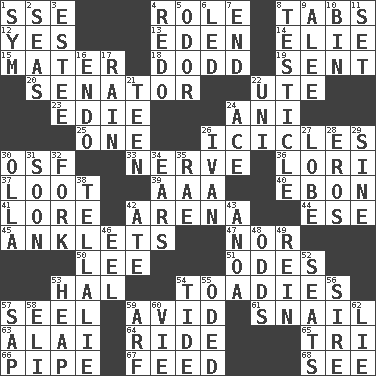 ACROSS 1. Compass dir. 4. Hero or heavy, e.g. 8. Bar bills 12. It is so 13. Paradise 14. Writer Wiesel 15. Mother 18. Texas town _ City 19. Transmitted 20. Elected representative 22. Shoshoni 23. Singer Brickell 24. Cuckoo 25. Single 26. Winter's stalactites 30. Order of Saint Francis (abbr.) 33. Boldness 36. Australian parrot (variant) 37. Plunder 39. Auto club (abbr.) 40. Inky black, to poets 41. Old wives' tales, e.g. 42. Sports stadium 44. Compass dir. 45. Short socks 47. And not 50. Area sheltered from the wind 51. Lyric poems 53. Actor Linden 54. Sycophants 57. Stitch closed the eyes of (a falcon) 59. Enthusiastic 61. Slow-paced one 63. Mountain range southwest of Kyrgyzstan 64. Travel on or in a vehicle 65. Three (prefix) 66. Corncob 67. Nourish 68. Perceive with the eye DOWN 1. Symbol (abbr.) 2. Oceans 3. First name in cosmetics 4. Do over again 5. Aroma 6. Directed 7. Conclusion 8. A testis 9. Toward shelter 10. Storage container 11. Put into a specified state 16. Inside; within (prefix) 17. Water falling in drops from the sky 21. Adolescent 22. University (slang) 24. Adept person 26. "Terrible" tsar 27. Ear part 28. Greek god of love 29. Trig term 30. Water jar 31. Within a short period 32. Tined utensil 34. Hearing organs 35. Actress Charlotte 38. Copy Pinocchio 42. Had dinner 43. Small Philippine buffalo 46. Snakelike fish 48. Probability 49. It's straight from the horse's mouth 52. Theater features 53. Pile 54. Periodic rise and fall of the sea level 55. Wrote a lyric poem 56. Title for a man of rank and authority 57. Plant excrement 58. Connecticut Ivy Leaguer 59. Sandy's bark 60. Compete 62. Falsehood