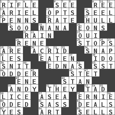 ACROSS 1. Firearm 6. Perceive with the eye 9. Portuguese money of account (variant) 12. Satellite of Uranus 13. Elects 14. Sew up the eyelids of hawks and falcons 15. Actor Sean's family 16. Pace 17. Frame or body of a ship 18. "Barney Miller" actor Jack 19. Grandmother 20. Immeasurably long periods of time 21. Water falling in drops from the sky 23. Fr. "Yes" 24. French philosopher Descartes 25. Halts 28. "We ___ not amused" (Victoria) 30. Bitter 34. Fastener 35. French article 36. Consumed 38. Wedding promise 39. In a ____ (agitated or irritated) 41. Ferber et al. 43. Fast jet (abbr.) 44. More peculiar 46. Proofreading order 48. Compass dir. 49. Comedian Laurel of Laurel & Hardy 50. "60 Minutes" Commentator Rooney 51. Those things 53. Small amount or degree 56. Louse (plural) 57. At sea 58. Bert's buddy 60. Wrote a lyric poem 61. Backtalk 62. Allots cards 63. Affirmative reply 64. Tate display 65. Makes a sale DOWN 1. Hit sharply and swiftly 2. Angers 3. A pale, very dry sherry 4. Poe poem 5. Raised railways 6. Connect, as a bridge 7. Singer James 8. Compass dir. 9. One who advocates reunion 10. Snakelike fish 11. Pipe bend 13. Northwest Algerian city 14. Yells 19. Sibling's daughter 20. Greek goddess of the dawn 22. Santa ___, CA 24. Homes 26. Groovy apts. 27. Blemish 28. In addition 29. Tear apart 31. Actress Charlotte 32. It would 33. Lair 37. Smutty 40. Watched over 42. R.R. building 45. Marina Del _, California 47. Main course 49. Oceans 50. Assistant 51. Russian ruler of old 52. Behest 54. Of or related to the anus 55. Deli pickle 56. Myrna of the movies 57. White ___ sheet 58. Begley and Asner 59. Curvy letter