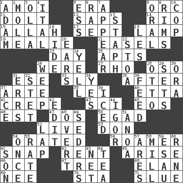 ACROSS 1. Mine, in Marseilles 5. Epoch 8. The grampus (Milton) 11. Dunce 12. Plant excrements 14. River (Sp.) 15. Assad's deity 17. Back-to-school mo. 18. Desk light 19. Ear of corn 21. Artist's stands 23. 24 hours 25. Flats, for short 26. Past tense of be (plural) 27. 17th letter of the Greek alphabet 28. Bear (Spanish) 31. Compass dir. 33. Secret 35. Following 37. Johnson of "Laugh-In" 38. Flowery wreath 40. Singer James 41. Streamer paper 43. _-fi 45. Greek goddess of the dawn 46. Eastern Standard Time (abbr.) 47. Two (Sp.) 50. Mild oath 52. Moving, as bait 53. Spanish title 54. Spoke pompously 56. Nomad 61. Fastener 62. Monthly bill 65. Ascend 66. Sep. follower 67. Family _ (genealogy) 68. Enthusiasm 69. Born 70. R.R. building 71. Change direction abruptly DOWN 1. First of billions? 2. Undercover agent 3. Spanish pot 4. Slanted text style (abbr.) 5. Double-curved letter 6. Actress Charlotte 7. Seem 8. Relating to the mouth 9. Basketball hoops 10. Police officer (slang) 13. Staphylococcus 16. Flintstone garb 18. French article 20. Hearing organs 22. Portico 24. Shout 26. Shed a tear 28. "Beetle Bailey" pooch 29. Arranges properly for use 30. Mouth or opening 31. Blunders 32. Proofreading order 34. Affirmative reply 36. Nourish 37. Adept person 39. On the rocks 42. Prepare for publication 44. Composer Stravinsky 48. Unconcealed 49. Spring feasts 51. Small Philippine buffalo 52. Infant locale 54. Single time 55. Assign a rank or rating to 57. Ancient Greek god of war 58. Place where flour is made 59. Son of Isaac 60. French philosopher Descartes 61. Male child 63. Fish or hair follower 64. Afternoon social gathering