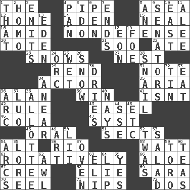ACROSS 1. Definite Article 4. Corncob 8. Toward the sea 12. Dwelling 14. Arabian gulf 15. Actress Patricia 16. Among 17. Unrelated to defense, as in spending 20. Carry 21. "Barney Miller" actor Jack 22. Had dinner 23. Frozen precipitation (plural) 27. Egg locale 29. Tear apart 31. Short letter 34. Thespian 35. Operatic vocal solo 36. Actor Alda or Thicke 39. Acquire through effort 41. Is not 42. Governing power 43. Artist's stand 46. Root beer relative 47. System (abbr.) 48. Relating to the mouth 51. Religious groups 54. The first octave above the treble staff 56. _ de Janeiro 58. Electrical Unit 61. Rotating or pertaining to rotation 66. Medicinal plant 67. Ship's personnel 68. Writer Wiesel 69. "Two Mules for Sister ____" 70. Sew up the eyelids of hawks and falcons 71. Pinches, bites 72. Two (Sp.) DOWN 1. Not this but _ 2. Same (prefix) 3. Gives off 4. Baking dish 5. Wedding promise 6. Animal enclosure 7. Conclusions 8. One (Scot) 9. Elected representatives 10. Compass direction 11. Toward shelter 13. Locale of original sin 18. Period of immesurable duration 19. Enemy 24. The grampus (Milton) 25. Soggy 26. Overwhelm 28. Slow-paced one 30. Frees from moisture 32. Metal container 33. Erode 34. Approach 36. Curve 37. Nilotic language 38. One to whom something is allotted 40. Negative votes 44. Compass dir. 45. And so on (abbr.) 49. Tate display 50. Cards in a Roman deck? 52. It was, poetically 53. Vegetable dish 54. Arches 55. Old wives' tales, e.g. 57. Baking chamber 59. "Corrida" creature 60. Afternoon social gatherings 62. Leather borer 63. Biblical high priest 64. Mouth edge 65. It is so