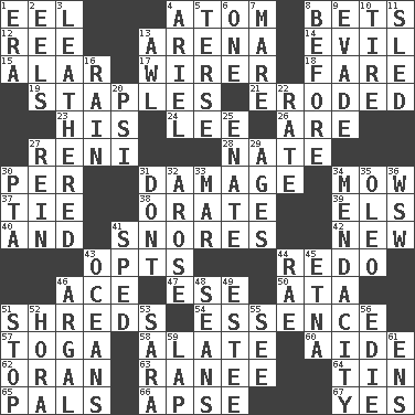 ACROSS 1. Snakelike fish 4. Smallest unit of an element 8. Stakes 12. To riddle 13. Sports stadium 14. Tending to cause great harm 15. Having or resembling wings 17. One who wires 18. Conductor's collection 19. Paper fasteners 21. Eaten away 23. Part of HMS, perhaps 24. Area sheltered from the wind 26. "We ___ not amused" (Victoria) 27. Painter Guido (1575-1642) 28. Nathan's nickname 30. For each 31. Break 34. Cut the grass 37. Standoff 38. Declaim 39. Raised railways 40. Added to 41. Sounds asleep 42. ___ Haven, CT 43. Chooses 44. Do over again 46. Adept person 47. Compass dir. 50. _ moment's notice (2 wds.) 51. Fragments 54. Substance 57. Ancient Roman robe 58. Having winglike extensions 60. Helper 62. NW Algerian seaport 63. The wife of a rajah (variant) 64. Metal container 65. Friends 66. Domed church section 67. Consenting reply DOWN 1. Period 2. Snakelike fish 3. Resembling or made to resemble leather 4. Satellite of Uranus 5. Laconic 6. Single 7. Female horse 8. Prior to 9. Dodge 10. Become fatigued 11. Downhill vehicle 13. Leather borer 16. Precipitation 20. 23rd letter of the Greek alphabet 22. Pace 25. Maternal 27. It's straight from the horse's mouth 29. Matures 30. Parent Teacher Association (abbr.) 31. Do not 32. Came up 33. Third mo. 34. Ananias' fault 35. Butter sub 36. Compass dir. 41. Broke a traffic law 43. Seas 44. Actress Charlotte 45. Inactive volcano in Sicily 46. Therefore, facetiously 48. Actors Connery and Penn 49. First name in cosmetics 51. Close up, plug up 52. Israeli folk dance 53. "Two Mules for Sister ____" 55. Observe 56. Singer Brickell 59. Pet locale 61. Followers of ems