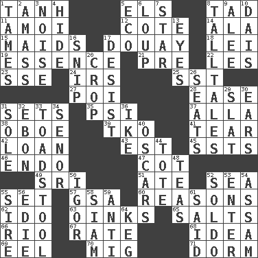 ACROSS 1. Hyperbolic tangent 5. Raised railways 8. Bit 11. Mine, in Marseilles 12. ____ d'Azur (French Riviera) 14. According to 15. Women servants 17. A city in N France, SE of Calais 18. Luau accessory 19. Center 21. Before (prefix) 22. French article 23. Compass dir. 24. Big collection agency 25. Fast jet (abbr.) 27. Luau course 28. Comfort 31. Arranges properly for use 35. Air pressure measure (abbr.) 37. Silent film actress Nazimova 38. Mitch Miller's instrument 39. Ring climax 41. Pull apart 42. Grant temporary use of 43. Eastern Standard Time (abbr.) 45. Fast planes 46. Inside; within (prefix) 47. Small bed 49. Indian title of respect (Mr.) 51. Had dinner 52. Ocean 55. Put into a specified state 57. Girls' org. (abbr.) 60. Thinks logically 62. Wedding promise 63. Pig sounds 65. Table seasonings 66. _ de Janeiro 67. Pace 68. The content of cognition 69. Snakelike fish 70. Russian fighter aircraft 71. Dormintory (informal) DOWN 1. Domesticates 2. Collect or gather 3. Annoying sound 4. Flintstone garb 5. Environmental prefix 6. Central Nebraska county 7. Play the lead 8. Baron Munchausen's specialties 9. Toward shelter 10. Raised platform 13. Snake ____ (dice throw) 16. Sever or remove by pinching or nipping 17. Stop 20. Riding implement 26. Theater features 29. Narrow board 30. Hearing organs 31. Not divided or shared with others 32. Inky black, to poets 33. Inedible or poisonous agaric 34. Sir (Sp.) 36. Mamie's husband 40. Motion picture awards 44. Carry 48. Beverages made from leaves 50. Russian composer Stravinsky 52. Twentieth part of a lira 53. Keyboard key 54. Indian state 55. Father 56. Singer Brickell 58. Thailand, formerly 59. Opposed to 61. Stated 64. Cask