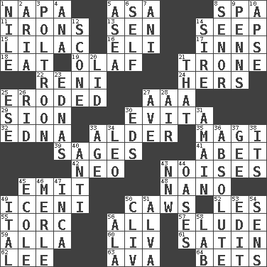 ACROSS 1. California wine valley 5. White ___ sheet 8. Health resort 11. Removes the wrinkles 13. Elected rep. 14. Ooze 15. Pale purple color 16. Connecticut Ivy Leaguer 17. Lodging establishments 18. Ingest 19. Norwegian king 21. Heavy duty weighing machine 22. Painter Guido (1575-1642) 24. Possessive pronoun 25. Eaten away 27. Auto club (abbr.) 29. The Jewish people; Israel 30. Webber/Rice musical 32. Pulitzer Prize-winning author Ferber 33. Tree or shrub in the Birch family 35. Wise men 39. Gurus 41. Collude with 42. Modern: prefix 43. Annoying sounds 45. Send forth 48. Billionth: prefix 49. Ancient Celtic tribe of eastern Britain 50. Crow sounds 52. French article 55. Torque (variant) 56. 100% 57. Evade 59. Silent film actress Nazimova 60. 54 in ancient Rome 61. Smooth fabric 62. Area sheltered from the wind 63. Actress Gardner 64. Wagers DOWN 1. Mediterranean tributary 2. Operatic vocal solo 3. Characterized by complete cowardliness 4. Santa ___, CA 5. Toward the sea 6. Automatically 7. Black tropical American cuckoo 8. Sir (Sp.) 9. Actor Sean's family 10. Domed church section 12. Biscuitlike quick bread 14. Title for a man of rank and authority 20. Flaplike covering 21. Not this but _ 23. Ferber et al. 25. Compass dir. 26. To free from 27. "___ Maria" 28. Atmosphere 30. Begley and Asner 31. At full speed 33. Grow older 34. Lion 36. Utter; complete 37. Turn to the right 38. It is 40. Opposed to 43. Compass dir. 44. Fertile tracts in a desert 45. Learning spot: Fr. 46. Haggard of country music 47. South American Indian 49. Slanted text style (abbr.) 50. 154 in Roman numerals 51. Inventor's middle name 53. Prepare for publication 54. Elected reps. 56. In the manner of 58. Experiment locale