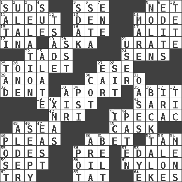ACROSS 1. Soap bubbles 5. Compass dir. 8. Fish or hair follower 11. Eskimo relative 13. Lair 14. Method 15. Stories 16. Had dinner 17. Came down and settled, as after flight 18. _ tizzy (2 wds.) 19. "____ silly question..." 21. A salt of uric acid 22. Small amounts or degrees 24. Elected reps. 25. Bathroom plumbing fixture 27. Compass dir. 29. Small Philippine buffalo 30. Capital of Egypt 32. Gouge 33. To the left, to Queeg 35. "This won't hurt ____!" 39. Be extant 41. Indian skirt 42. Medical imaging device (abbr.) 43. Medicinal drug used to evoke vomiting 45. At sea 48. Keg 49. Entreaties 50. Collude with 52. Scottish cap 55. Lyric poems 56. Before (prefix) 57. Peak District village in England 59. Back-to-school mo. 60. Petroleum 61. High-strength synthetic material 62. Attempt 63. Make lace 64. Makes supply last DOWN 1. Suttee (variant) 2. ____ Bator, Mongolia 3. Accusation by an informer 4. Institute legal proceedings 5. Neighbor of Neb. 6. Stalk of a moss capsule 7. Compass dir. 8. Pitcher Ryan 9. Prepares for publication 10. Wig 12. Sadhe (variant) 14. Female horse 20. Fast jet (abbr.) 21. One who uses or employs something 23. Having winglike extensions 25. Small boy 26. Single 27. Hearing organ 28. Be seated 30. Small bed 31. Fertile tracts in a desert 33. Wind 34. Air pressure measure (abbr.) 36. Sass 37. Lyricist Gershwin 38. Nervous spasm 40. Dec. holiday 43. Frozen water 44. Eucharist need 45. Tree or shrub in the Birch family 46. Not well drained, as in land 47. Compass direction 49. Mail 50. Roberta Peters solo 51. Waist strap 53. Medicinal plant 54. Not women's 56. Cooking vessel 58. Color