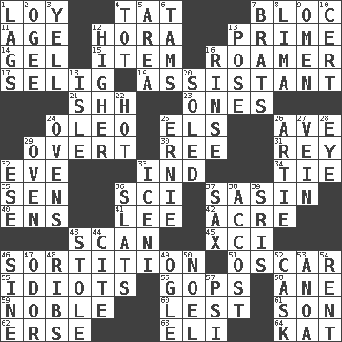 ACROSS 1. Myrna of the movies 4. Make lace 7. Group of countries in special alliance 11. Ripen 12. Israeli folk dance 13. First class 14. Set 15. Detail 16. Nomad 17. Former Milwaukee Brewers owner Bud 19. Aide 21. Quiet! 23. Singles 24. Butter sub 25. Raised railways 26. "___ Maria" 29. Unconcealed 30. To sift 31. Marina Del _, California 32. Night before a holiday 33. Indiana (abbr.) 34. Neckwear 35. Elected rep. 36. _-fi 37. Indian antelope 40. Followers of ems 41. Area sheltered from the wind 42. Measure of real estate 43. Skim 45. One more than ninety 46. Conclusion 51. Witty Wilde 55. Foolish or stupid persons 56. Republicans 58. A saturated hydrocarbon 59. Having high moral qualities 60. For fear that 61. Manchild 62. Celtic language 63. Biblical high priest 64. Krazy ___ of comics DOWN 1. Falls behind 2. Double curve, resembling the letter S 3. Shout 4. Small child 5. Length times width 6. Scottish caps 7. Naughty children 8. Pale green bean 9. Presage 10. Foregone conclusion 12. Having greater elevation 13. Introduce or present, as a question 16. Wash lightly 18. Small island 20. Having a sole or soles 22. Being at a high temperature 24. Baking chambers 25. Bert's buddy 26. Nick name for Arthur 27. Distinctive style or manner 28. Sight organ 29. Baking chamber 32. Compass dir. 33. Ancient Celtic tribe of eastern Britain 36. Narrow boards 37. Saxophone 38. Buttonhole 39. Indian titles of respect 43. Took without asking 44. Quote 46. Trig term 47. Aroma 48. Chest bones 49. Stare at amorously 50. Christmas carol 52. Keg 53. Small Philippine buffalo 54. Monthly bill 57. 23rd letter of the Greek alphabet