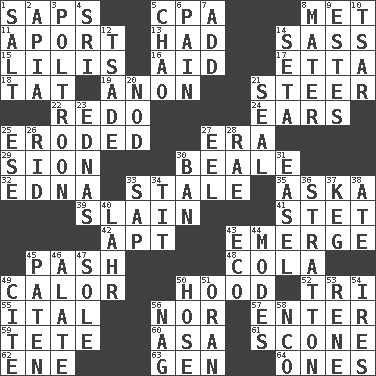 ACROSS 1. Plant excrements 5. Numbers guy (abbr.) 8. Was introduced to 11. To the left, to Queeg 13. Possessed 14. Backtalk 15. Ms. Damita and namesakes 16. Help 17. Singer James 18. Make lace 19. At once, immediately (arch.) 21. Navigate 22. Make new 24. Hearing organs 25. Worn away 27. Period 29. The Jewish people; Israel 30. Memphis, Tenn. Street 32. Pulitzer Prize-winning author Ferber 33. Showing deterioration from age 35. "____ silly question..." 39. Killed 41. Proofreading order 42. Fitting 43. Develop 45. Romantic infatuation 48. Root beer relative 49. Bodily heat indicating an inflammation 50. Parka part 52. Three (prefix) 55. Slanted text style (abbr.) 56. Not either 57. Keyboard key 59. Wig 60. White ___ sheet 61. Biscuitlike quick bread 62. Compass dir. 63. Commissioned military rank (abbr.) 64. Washington bills DOWN 1. Table seasoning 2. Capital of Western Samoa 3. Characterized by complete cowardliness 4. _ Lanka 5. US Secretary of Labor Elaine L. _ 6. Ache 7. Say or write further 8. Mother 9. _____ Park, CO 10. Russian ruler of old 12. Sadhe (variant) 14. Bristle 20. Dreamland 21. Lick closed 23. Ferber et al. 25. Compass dir. 26. To free from 27. Snakelike fish 28. Actress Charlotte 30. Prohibit 31. Artist's stand 33. Plant excrement 34. Teat (slang) 36. Ski resort town in Vermont 37. Cask 38. Had dinner 40. Cowardly lion portrayer 43. Environmental prefix 44. Methods 45. Eucharist need 46. Having winglike extensions 47. Flatfish 49. Quote 50. Stockings 51. NW Algerian seaport 53. French philosopher Descartes 54. Angers 56. Tired old horse 58. Non-commissioned officer (abbr.)