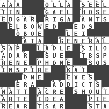ACROSS 1. American Automobile Association (abbr.) 4. Spanish pot 8. Sew up the eyelids of hawks and falcons 12. Shallow baking pan 13. Highlander 14. Stockings 15. _ Allan Poe 18. Port city in Latvia 19. Pismires 20. Shoved, as through a crowd 22. Begley and Asner 23. Mitch Miller's instrument 24. Luau accessory 25. _ moment's notice (2 wds.) 26. Commissioned military rank 30. Plant excrement 33. Dipping utensil 36. Grain storage tower 37. The sixth month of the Jewish calendar 39. Take to court 40. Cook's measure (abbr.) 41. French philosopher Descartes 42. Give a jingle 44. Distress signal 45. Heighten or intensify 47. Krazy ___ of comics 50. Single 51. Nights before holidays 53. Epoch 54. Inveterate users 57. Electrical Unit 59. Measure of real estate 61. Yell 63. Johnson of "Laugh-In" 64. The main thing one is thinking about 65. Sliced dessert 66. Posterior 67. Russian ruler of old 68. R.R. building DOWN 1. Had dinner 2. Assistant 3. White American of non-Hispanic descent 4. Legendary monster 5. Put down 6. Part of a journey 7. Insect wing 8. Most questionable 9. Immeasurably long periods of time 10. Eastern Standard Time (abbr.) 11. French article 16. Swedish rock group 17. Carrot, for example 21. Welt 22. Car or cant ending 24. Area sheltered from the wind 26. Small, secluded valley 27. Teases 28. In addition 29. Chops off 30. Indian skirt 31. Arabian gulf 32. Baking dishes 34. American tennis player Robert 35. Superhero pair 38. News announcer 42. Before (prefix) 43. Made supply last 46. _ tizzy (2 wds.) 48. Deliberation 49. Technician 52. Halts 53. Singer James 54. Type of rug 55. Letter starter 56. Set or collection 57. Armed conflict 58. "We ___ not amused" (Victoria) 59. Small island 60. Music discs 62. Beverage made from leaves
