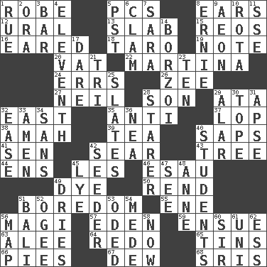 ACROSS 1. Loose flowing garment 5. Personal Computers (abbr.) 8. Hearing organs 12. Mountain range 13. Thick slice 15. Vintage cars 16. Having ears or earlike features 18. Edible starchy tuberous root 19. Brief written record 20. Large container 22. Chrissie's court nemesis 24. Blunders 26. Last letter of the English alphabet 27. Famous astronaut Armstrong 28. Boy, to dad 29. "One Day ___ Time" 32. 90 degrees 35. Against 37. Trim (branches) 38. Nursemaid 39. Afternoon social gathering 40. Plant excrements 41. Elected rep. 42. Dry up 43. Woody plant 44. Followers of ems 45. French article 46. He sold his birthright 49. Color 50. Tear apart 51. Mood resulting from idleness 55. Compass dir. 56. Wise men 57. Genesis locale 59. Take place subsequently 63. Toward shelter 64. Do over again 65. Canisters 66. Sliced desserts 67. Morning condensation 68. Indian titles of respect DOWN 1. Sorrow 2. Mouth or opening 3. Long, evenly shaped piece 4. Veterans Day date 5. Pacific Standard Time (abbr.) 6. Dollar (slang) 7. "Two Mules for Sister ____" 8. Bert's buddy 9. A really long time 10. Roll call or roster of names 11. Compass dir. 14. Russian wolfhound 17. Have the gumption 21. Three (prefix) 23. Nine, plus one 25. Chalkboards 28. A viewer who gazes fixedly 29. Having or resembling wings 30. Drink excessively 31. Domed church section 32. Comfort 33. So be it 34. Without 36. Teachers' org. 40. SAT takers 42. Sowing specialist 45. Sodium hydroxide 47. Observe 48. Queen of England 1702-14 49. Frees from moisture 51. Indonesian resort city 52. Double curve, resembling the letter S 53. Wrote a lyric poem 54. Ancient Persian 56. Atlas unit 58. Immediately 60. Title for a knight 61. University (slang) 62. Curvy letter