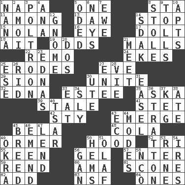 ACROSS 1. California wine valley 5. Single 8. R.R. building 11. Amid 13. Simpleton 14. Discontinue 15. Pitcher Ryan 16. Sight organ 17. Dunce 18. Small island 19. Probability 21. Promenades 22. San ____ (Riviera town) 24. Supplements with great effort 25. Eats (away) 27. Night before a holiday 29. The Jewish people; Israel 30. Join together 32. Pulitzer Prize-winning author Ferber 33. First name in cosmetics 35. "____ silly question..." 39. Having lost freshness 41. Proofreading order 42. Filthy place 43. Develop 45. Actor Lugosi 48. Root beer relative 49. Channel Islands abalone 50. Parka part 52. Three (prefix) 55. Peachy ____! 56. Set 57. Keyboard key 59. Tear apart 60. Wet nurse (var.) 61. Biscuitlike quick bread 62. Increase 63. Overdraft (abbr.) 64. Washington bills DOWN 1. Nanny 2. Mine, in Marseilles 3. Characterized by complete cowardliness 4. Santa ___, CA 5. Wrote a lyric poem 6. Negative votes 7. She-sheep 8. Took without asking 9. For Whom the Bell _____ 10. Flats, for short 12. Dwarf 14. Neighbor of Neb. 20. Two (Sp.) 21. Rendezvous 23. Ferber et al. 25. Compass dir. 26. To free from 27. Compass dir. 28. Compete 30. Shoshoni 31. Artist's stand 33. Ingest 34. Insidious 36. Ski resort town in Vermont 37. Cask 38. Had dinner 40. Russian ruler of old 43. Environmental prefix 44. Methods 45. A special lineage 46. Make improvements or corrections to 47. Grant temporary use of 49. Gumbo ingredient 50. Cloth borders 51. Norwegian king 53. French philosopher Descartes 54. Angers 56. Separate the seeds from cotton 58. Non-commissioned officer (abbr.)