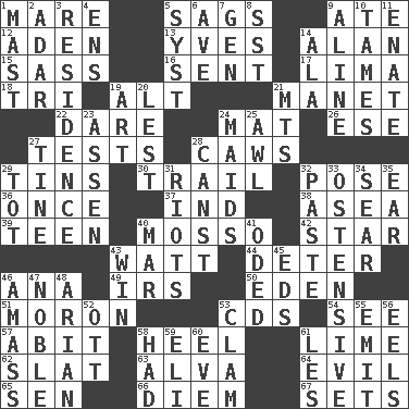 ACROSS 1. Female horse 5. Droops 9. Had dinner 12. Arabian gulf 13. Jacques Cousteau's middle name 14. Actor Alda or Thicke 15. Backtalk 16. Transmitted 17. Pale green bean 18. Three (prefix) 19. The first octave above the treble staff 21. French painter Edouard 22. Have the gumption 24. Floor covering 26. Compass dir. 27. Trials 28. Crow sounds 29. Metal containers 30. Go after with the intent to catch 32. Airs 36. At one time in the past 37. Working for oneself (abbr.) 38. Toward the sea 39. Adolescent 40. With motion or animation 42. Play the lead 43. Electrical Unit 44. Prevent from occurring 46. Santa ___, CA 49. Big collection agency 50. Locale of original sin 51. Person of subnormal intelligence 53. Music discs 54. Observe 57. "This won't hurt ____!" 58. The bottom of a shoe or boot 61. Citrus frut 62. Narrow board 63. Inventor's middle name 64. Morally bad or wrong 65. Elected rep. 66. South Vietnam president (1954) 67. Puts into a specified state DOWN 1. Vertical spar for supporting sails 2. The sixth month of the Jewish calendar 3. Dwelling 4. Followers of ems 5. System (abbr.) 6. "___ Maria" 7. Commissioned mil. rank 8. Fast jet (abbr.) 9. Place in a line 10. Corrects by punishment or discipline 11. Related on the mother's side 14. According to 19. Nonscientific branch of learning 20. For fear that 21. Mountains (abbr.) 23. NE Netherlands city 24. Women servants 25. Leather borer 27. Prong on a fork 28. 2nd pers. sing. pres. of can (arch.) 29. Small child 31. Disturbances 32. Thick mixture 33. Clearly or manifestly demonstrative 34. Scorch 35. Hearing organ 40. Third mo. 41. Wrote a lyric poem 43. Acquire through effort 45. Begley and Asner 46. Collect or gather 47. Impressive in appearance 48. Believer in; advocate of (suffix) 52. Baseball player Mel 53. Dollar (slang) 55. Send forth 56. Snakelike fish 58. Possessed 59. Biblical high priest 60. First lady 61. French article