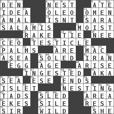 ACROSS 1. Benjamin's nick name 4. A home for chicks 8. Had dinner 11. It may be bright or harebrained 13. Margarine 14. Presage 15. Of or related to the anus 16. Is not 17. "Two Mules for Sister ____" 18. Deli grouping 21. Wet 22. Libertine 23. Standoff 25. Born 26. Corporate head (abbr.) 29. One of the two male reproductive glands 32. Insides of hands 34. "We ___ not amused" (Victoria) 35. Big _ 38. Toward the sea 39. Having a sole or soles 41. SW Asia republic 43. Ovum 44. Ripen 45. Ascend 46. Consumed 50. Alias (abbr.) 51. Ocean 54. Compass dir. 55. Conclusions 57. Small island 59. Nestling 63. Small amounts or degrees 64. Downhill vehicle 67. Type of rug 68. Makes supply last 69. Drop; flow; fall 70. Respite 71. Title for a knight 72. Uncontrolled 73. A female animal or person DOWN 1. Prejudice 2. Pulitzer Prize-winning author Ferber 3. Anneal 4. Annoying sounds 5. Raised railways 6. Elected rep. 7. Small child 8. With great haste 9. Laconic 10. Related on the mother's side 12. Having or resembling wings 14. Bear (Spanish) 19. Floor protectors 20. D.D.E's nickname 21. Cartoonist voice _ Blanc 23. Hoop that covers a wheel 24. On the rocks 26. Accounting whiz (abbr.) 27. Relaxation 28. Cassini of fashion 30. Falsehoods 31. Independent ruler or chieftain 33. Wise men 36. Operatic vocal solo 37. Keg 39. Sinks 40. Double curve, resembling the letter S 42. Teachers' org. 45. Sums up 47. Fish or hair follower 48. Watched over 49. Compass dir. 51. Locates 52. 1973 Nobel Price Winner (Physics) Leo 53. Tree or shrub in the Birch family 56. Play the lead 58. Double-curved letter 60. Angers 61. Delicate 62. Yard entry 64. Compass dir. 65. Cards in a Roman deck? 66. Pipe bend