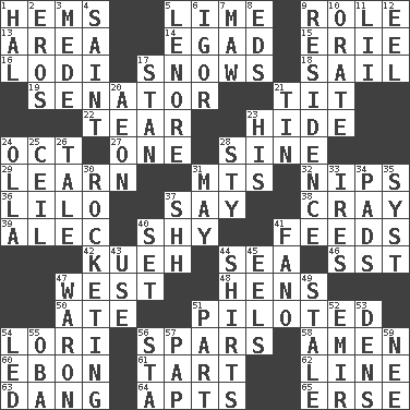 ACROSS 1. Cloth borders 5. Citrus frut 9. Hero or heavy, e.g. 13. Length times width 14. Mild oath 15. 4th largest of the Great Lakes 16. Farming town in central California 17. Frozen precipitation (plural) 18. Move on water 19. Elected representative 21. Teat (slang) 22. Pull apart 23. Flintstone garb 24. Sep. follower 27. Single 28. Trig term 29. Memorize 31. Mountains (abbr.) 32. Cuts off 36. _ and Stitch 37. Declare 38. Supercomputer manufacturer 39. Actor Baldwin 40. Like a shrinking violet 41. Eats 42. Malaysian steamed pastry 44. Ocean 46. Fast jet (abbr.) 47. Compass direction 48. Coop moms 50. Had dinner 51. Manned the helm 54. Australian parrot (variant) 56. Practice fights 58. So be it 60. Inky black, to poets 61. Small pie 62. Actor's bit 63. Mild oath, euphamism for damn 64. Flats, for short 65. Celtic language DOWN 1. Actor Linden 2. Greek god of love 3. Ancient Persian 4. Virtuous person 5. Poe poem 6. Composer Stravinsky 7. Opening into something insatiable 8. Begley and Asner 9. Home 10. Speak pompously 11. Cards in a Roman deck? 12. Snakelike fish 17. Comedian Laurel of Laurel & Hardy 20. A really long time 21. Metal container 23. Part of HMS, perhaps 24. Water jar 25. To provide with a ceiling 26. Falsehood 28. Filthy place 30. Shooting up abruptly 31. Can I? 33. Angers 34. Groovy apts. 35. System (abbr.) 37. Quiet! 40. Arrange properly for use 41. Papal veil 43. Purpose 44. Chest coverings 45. Snakelike fish 47. Make _____ (do battle with) 49. Lacking originality or spontaneity 51. Component 52. Arab leader 53. Lairs 54. Directed 55. Chief or king in Benin or Nigeria 56. R.R. building 57. Infant food 59. Born
