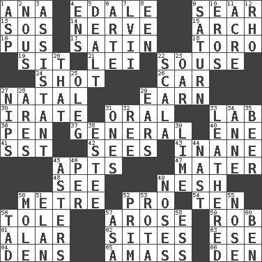 ACROSS 1. Santa ___, CA 4. Peak District village in England 9. Shrivel 13. Mayday 14. Effrontery 15. Bowlike part 16. Product of festering 17. Smooth fabric 18. "Corrida" creature 19. Be seated 21. Flowery wreath 22. Boozer 24. Went for two points 26. 4-wheeled motor vehicle 27. Relating to or accompanying birth 29. Merit 30. Feeling or showing extreme anger 31. Of the mouth 33. Experiment locale 36. Writing instrument 37. Commissioned military rank 40. Compass dir. 41. Fast jet (abbr.) 42. Perceives with the eye 43. Silly 45. Flats, for short 47. Mother 48. Observe 49. Tender 50. Distance measurement (Brit.) 52. Adept person 54. "___ Little Indians" 56. Lacquered or enameled metalware 57. Came up 59. Director Reiner 61. Having or resembling wings 62. Settings 63. Compass dir. 64. Hiding places for outlaws 65. Collect or gather 66. Lair DOWN 1. Viper 2. Common sense 3. Helper 4. Followers of ems 5. Started a card game 6. Johnson of "Laugh-In" 7. 57 in ancient Rome 8. Car or cant ending 9. Titan orbits this 10. Greek god of love 11. Land measure 12. 17th letter of the Greek alphabet 20. Not this but _ 22. Any of the three canals of the cochlea 23. Boat paddle 25. Cassini of fashion 27. Cuts off 28. Ancient Greek god of war 29. Hearing organs 31. Washington bills 32. To sift 33. Tough but pliablecoriaceous 34. Singer Murray 35. Fermented drink made from hops 38. First name in cosmetics 39. Citrus frut 44. Political cartoonist Thomas 45. Michaelmas daisies 46. For each 49. Olfactory organs 50. Undercover agent 51. Style 52. Demure 53. Roll call or roster of names 55. Characteristic smell of wine 56. Small boy 57. White ___ sheet 58. Curvy letter 60. Benjamin's nick name