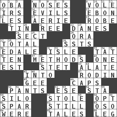 ACROSS 1. Chief or king in Benin or Nigeria 4. Olfactory organs 9. Grand slam 13. Big collection agency 14. Vices 15. Inky black, to poets 16. French article 17. Nest on high 18. Loose flowing garment 19. Shallow baking pan 21. To riddle 22. Natives or inhabitants of Denmark 24. Religious group 26. Mouth or opening 27. "_____ Recall" 29. Fast planes 30. Peak District village in England 31. Small island 33. Make lace 36. "___ Little Indians" 37. Modes 40. Single 41. Eastern Standard Time (abbr.) 42. Proofreading order 43. Having winglike extensions 45. To the inside or interior of 47. "The Thinker" sculptor 48. Turn to the right 49. Balmoral and tarboosh 50. Leg coverings 52. Compass dir. 54. R.R. building 56. Grain storage tower 57. Fur scarf 59. Choose 61. Coast Guard woman 62. Free of sound 63. Bear (Spanish) 64. We are 65. Falsehoods 66. Part of a journey DOWN 1. Lubricate 2. Cy Young winner Saberhagen 3. Helper 4. Teachers' org. 5. Unconcealed 6. Father 7. Writer Wiesel 8. Compass dir. 9. Actresses Bloom and Felton 10. Mitch Miller's instrument 11. Tennis shots 12. Compass dir. 20. Actress Patricia 22. Administered medicine 23. Tate display 25. Clement's nick name 27. Wig 28. Lyric poems 29. Narrow, elongated depression 31. "Tell ____ the Marines!" 32. A female animal or person 33. Inedible or poisonous agaric 34. Opposed to 35. Adolescent 38. _____ Park, CO 39. "Two Mules for Sister ____" 44. Chops off 45. Refuse to acknowledge 46. Fish or hair follower 49. Cell (Danish) 50. Corncob 51. Having or resembling wings 52. Singer James 53. The visible part of the earth's surface 55. Domed church section 56. Compass dir. 57. Fast jet (abbr.) 58. Raised railways 60. Coat; cloak